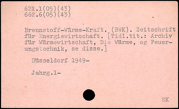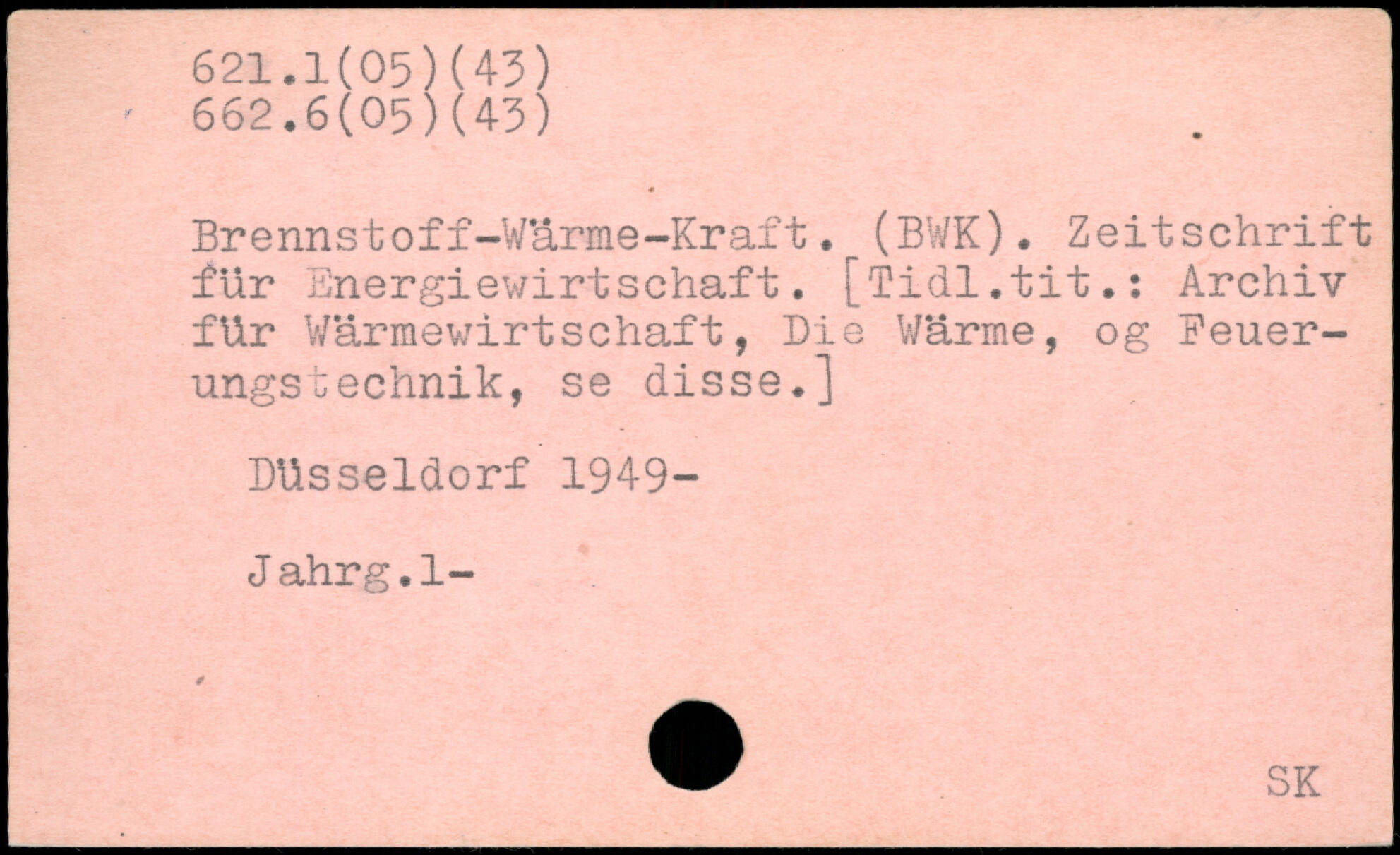 Brennstoff-Wärme-Kraft._(BWK). Zeitschrift für Energiewirtschaft. [Tidl.tit.: Archiv fUr WärmeWirtschaft, Die Wärme, og Feuerungstechnik, se disse.j Düsseldorf 1949- Jahrg.l-