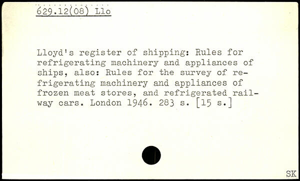 Lloyd's register of shipping: Rules for refrigerating machinery and appliances of ships, also: Rules for the survey of refrigerating machinery and appliances of frozen meat stores, and refrigerated railway cars. London 194-6.