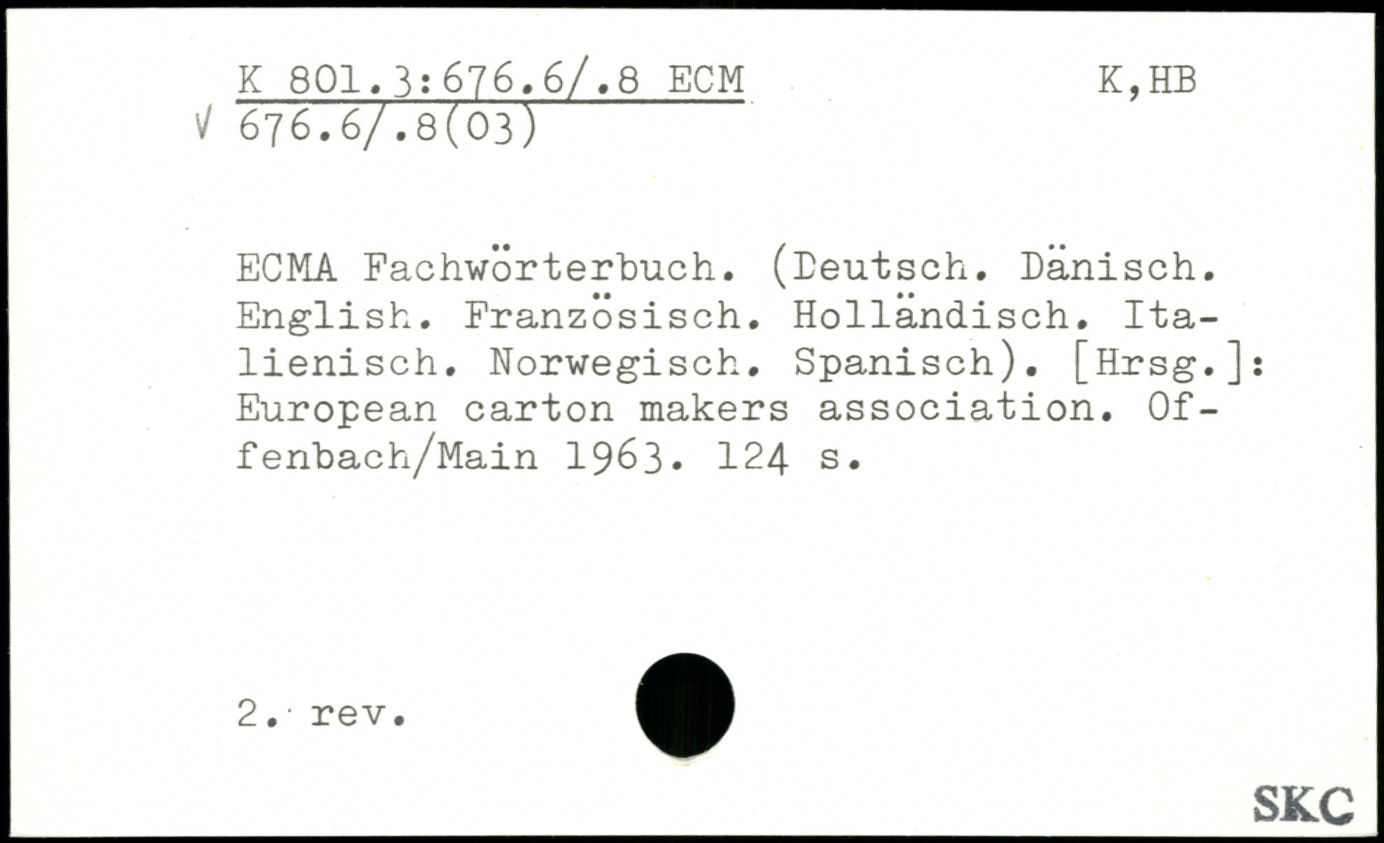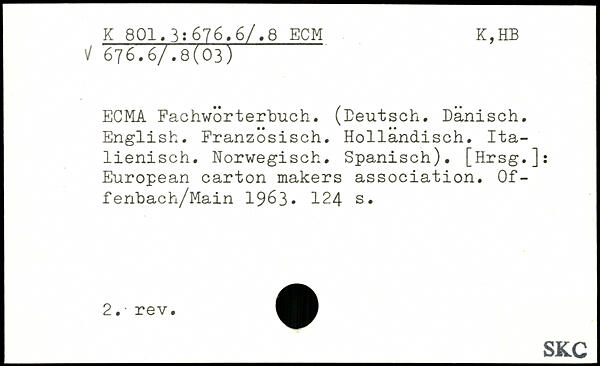 ECMA Fachwörterbuch. (Deutsch. Dänisch. English. Französisch. Holländisch. Italienisch. Norwegisch. Spanisch). [Hrsg.]: European carton makers association. Of-fenbach/Main 1963.