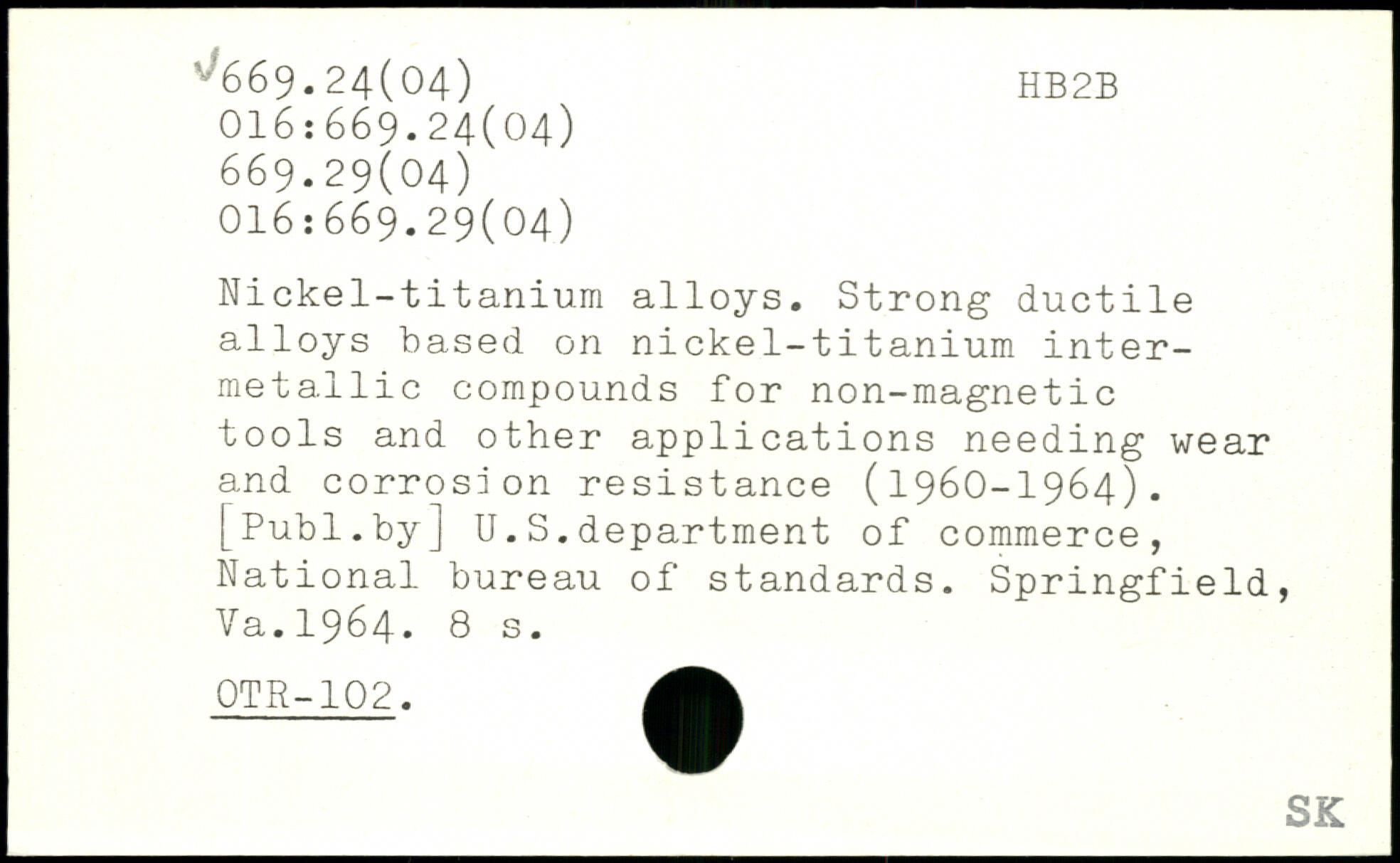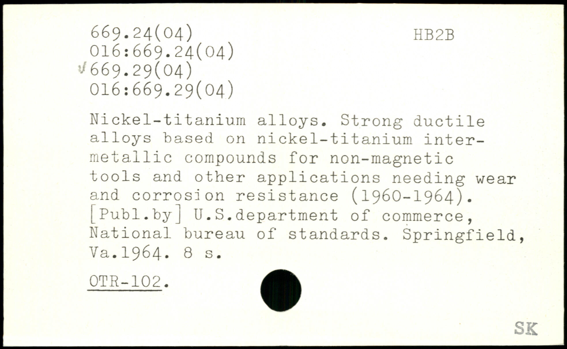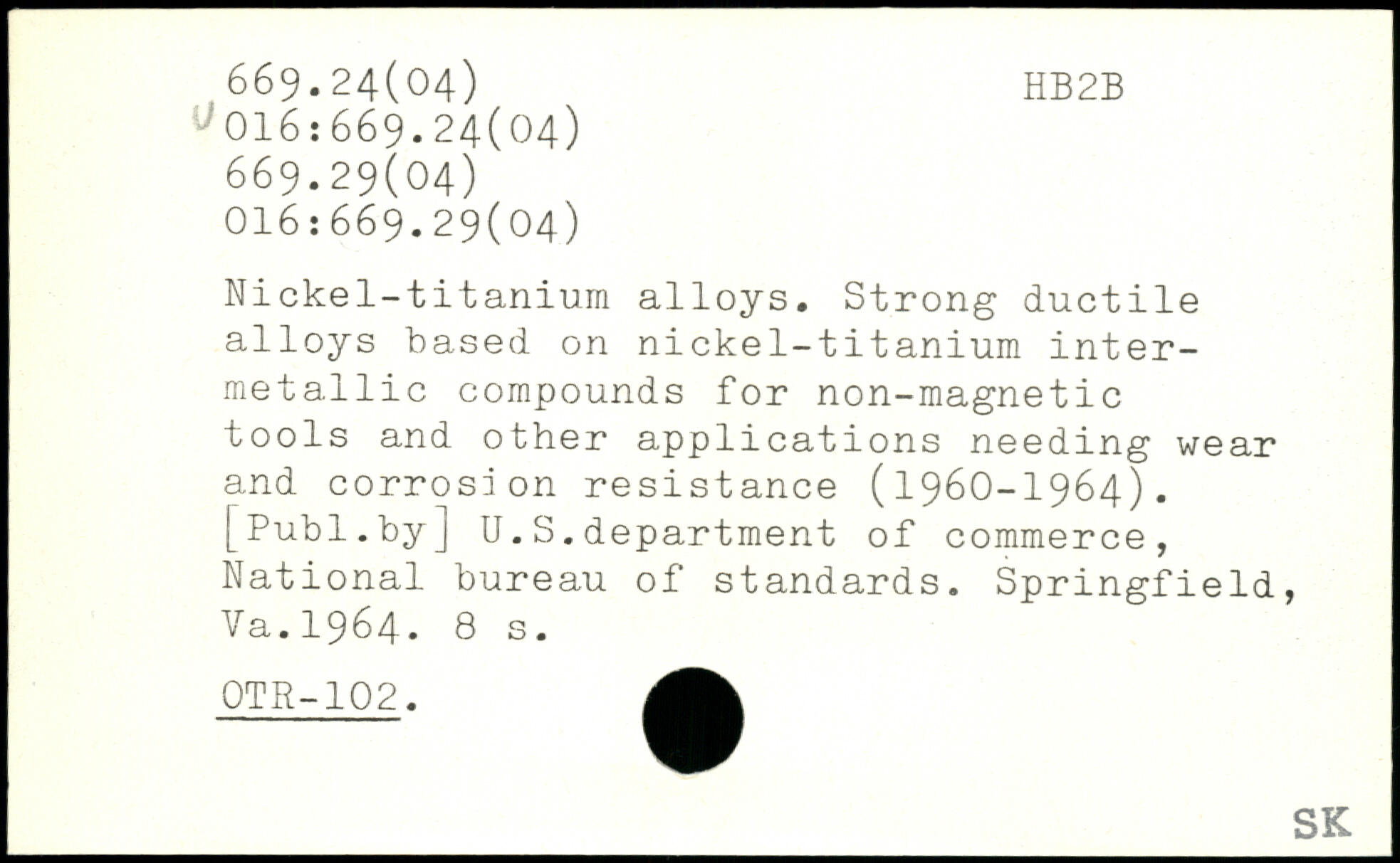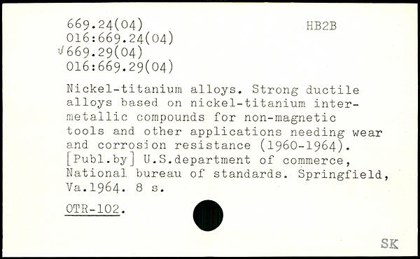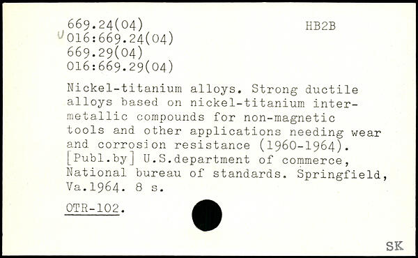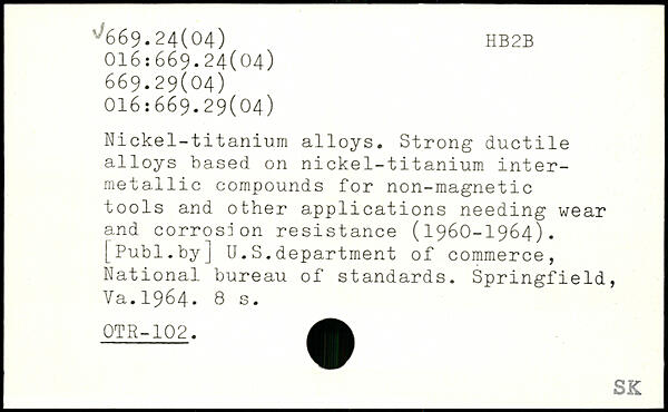 Nickel-titanium alloys. Strong ductile alloys based on nickel-titanium inter-metallic compounds for non-magnetic tools and other applications needing wear and corrosion resistance (1960-1964).