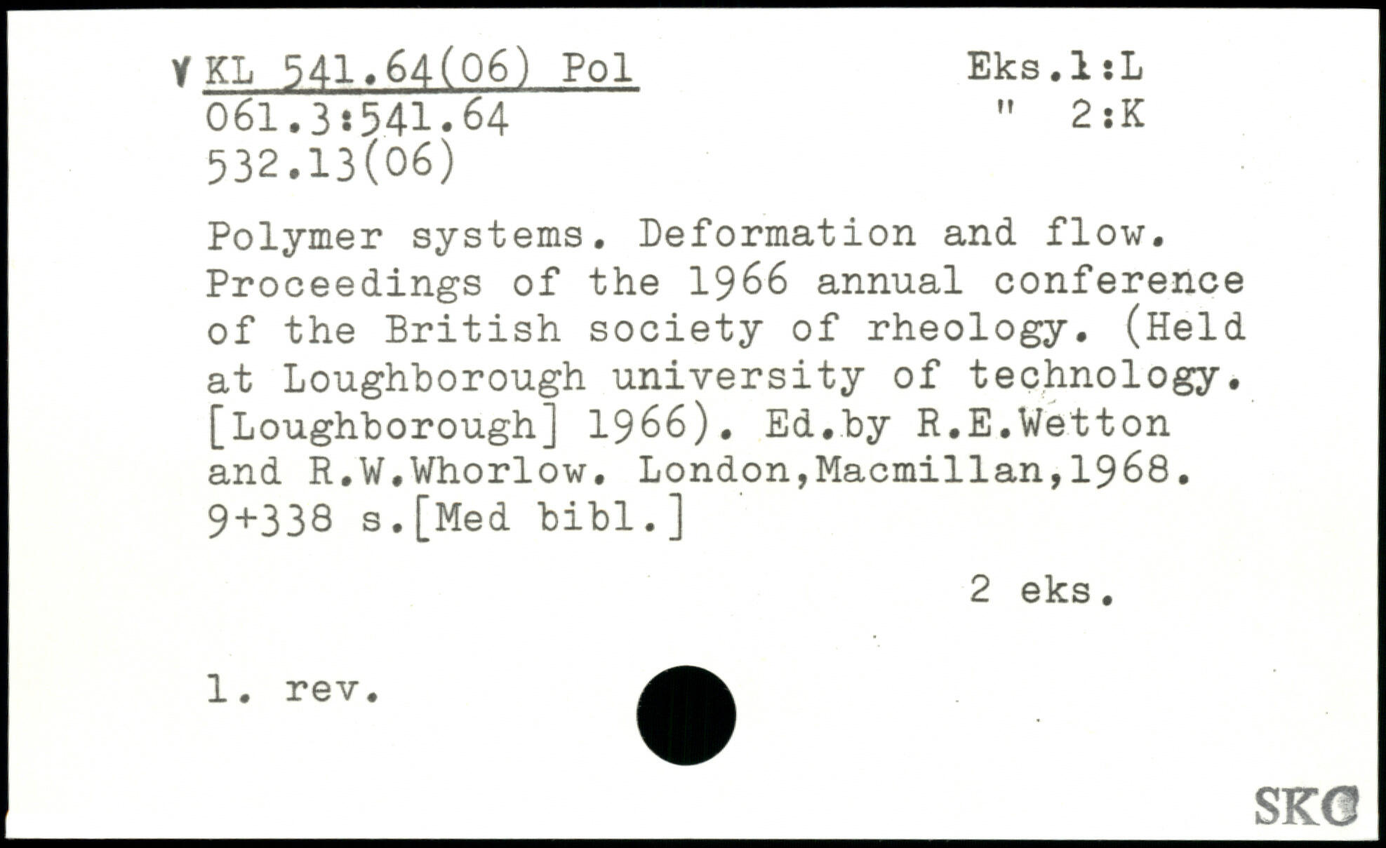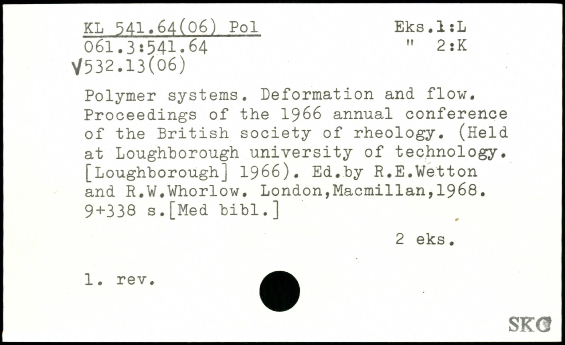 Polymer systems. Deformation and flow. Proceedings of the 1966 annual conference of the British society of rheology. (Held at Loughborough university of technology. [Loughborough] 1966). Ed.by R.E.Wetton and R.W.Whorlow.