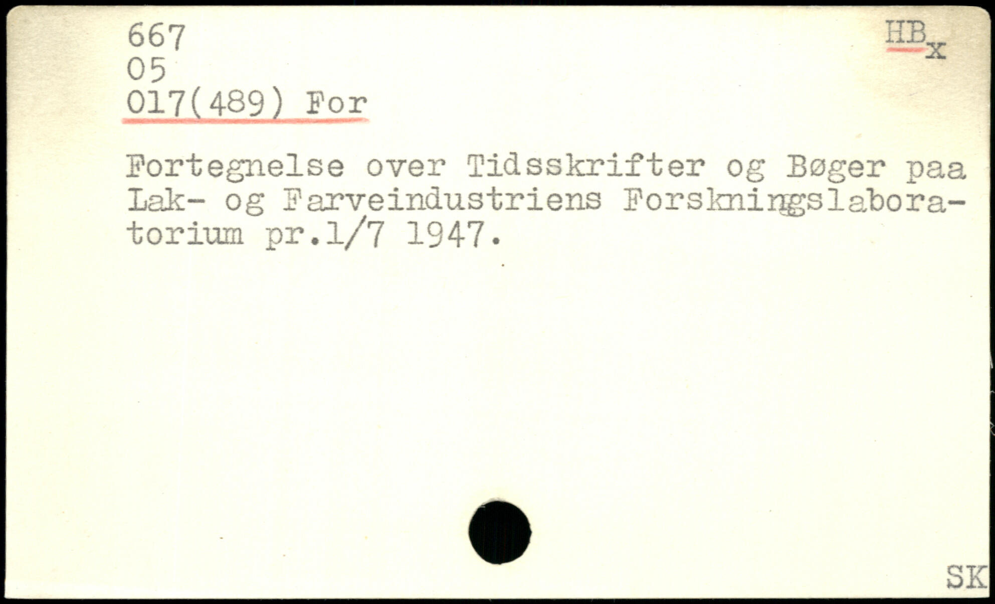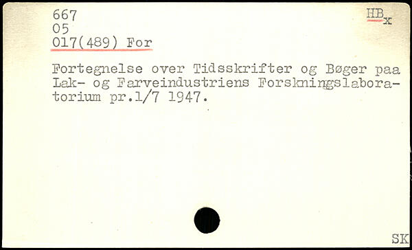 Fortegnelse over Tidsskrifter og Bøger paa Lak- og Farveindustriens Forskningslaboratorium pr.1/7 1947.