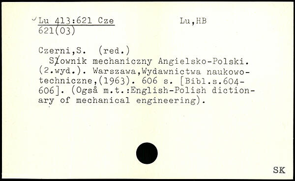 S/ownik mechaniczny Angielsko-Polski. (2.wyd.). Warszawa,Wydawnictwa naukowo-techniczne,(1963).