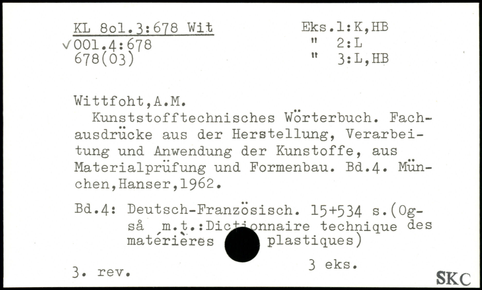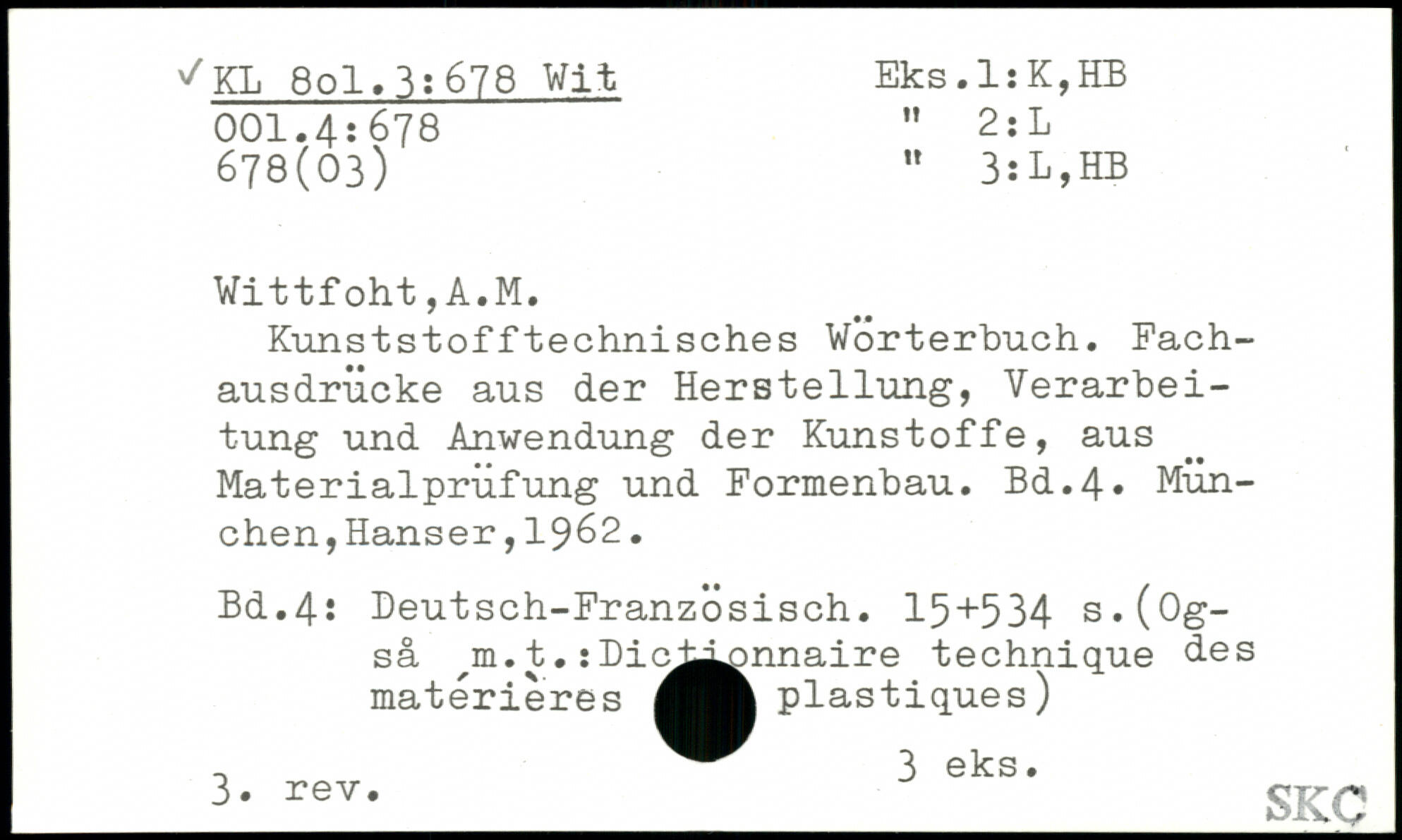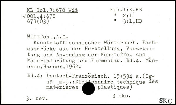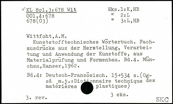 Kunststofftechnisches Wörterbuch. Fachausdrücke aus der Herstellung, Verarbeitung und Anwendung der Kunstoffe, aus Materialprüfung und Formenbau.