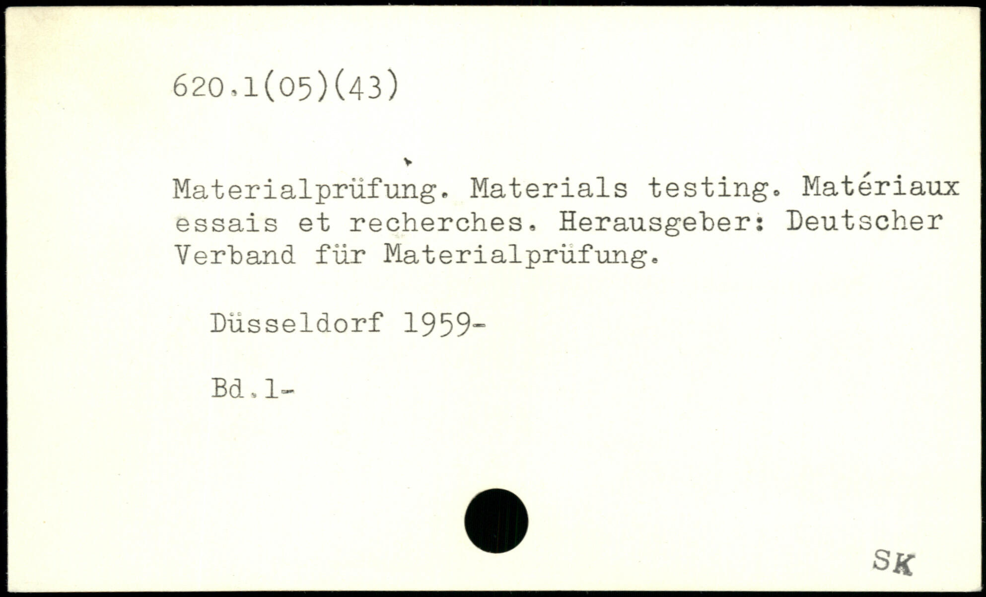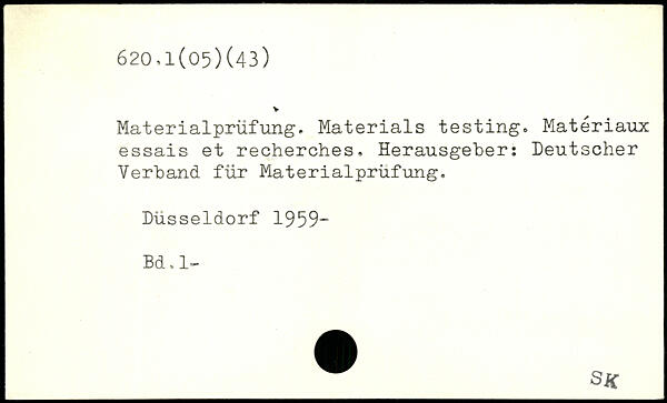 Materialprüfung. Materials testing. Matériaux essais et recherches, Herausgeber: Deutscher Verband für Materialprüfung. Düsseldorf 1959- Bd.l-