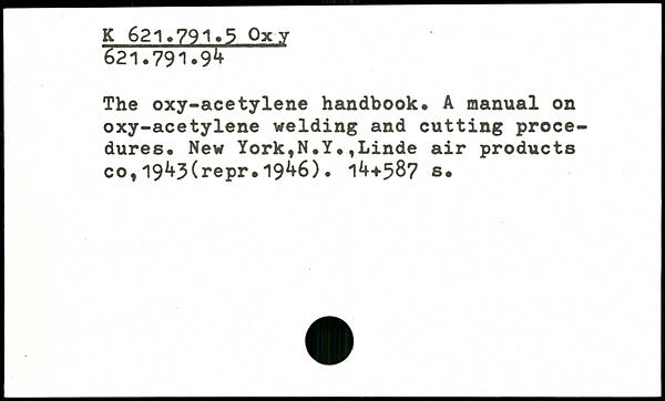 The oxy-acetylene handbook. A manual on oxy-acetylene welding and cutting procedures. New York,N.Y.,Linde air products co,19i+3(repr.19i+6). 1^+507