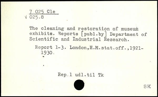 The cleaning and restoration of museum exhibits. Reports [publ.by] Department of Scientific and Industrial Research. Report 1-3. London,H.M.stat.off.,1921- 1930c Rep;1 udl.til Tk
