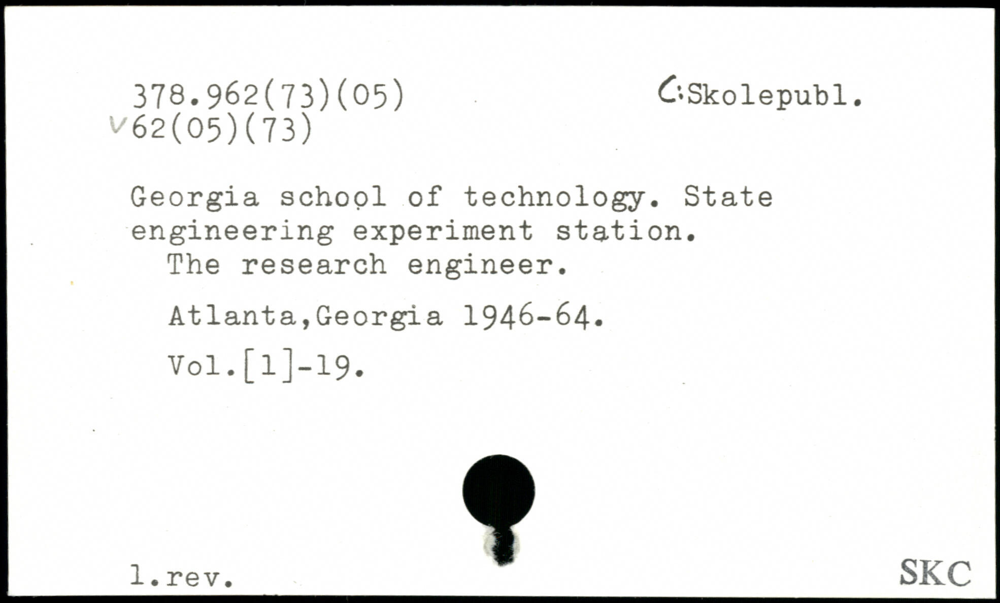 Georgia school of technology. State engineering experiment station. The research engineer. Atlanta,Georgia 1946-64. Vol.[1]—19. l.rev. SKC