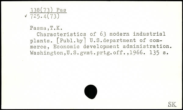 Characteristics of 63 modem industrial plants. [Puhl.hy] U.S.department of commerce, Economie development administration. Washington,ü.S.gvmt.prtg.off.,1966.