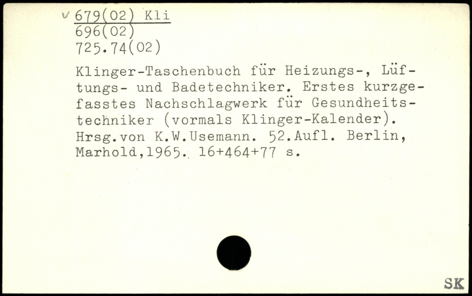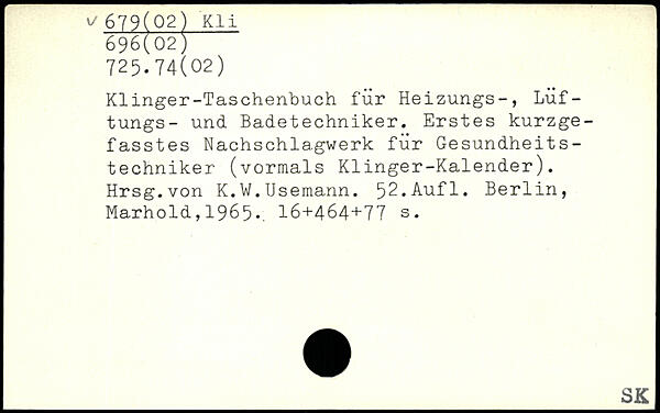 Klinger-Taschenbuch für Heizungs-, Lüf-tungs- und Badetechniker. Erstes kurzgefasstes Nachschlagwerk für Gesundheitstechniker (vormals Klinger-Kalender). Hrsg.von K.W.Usemann.