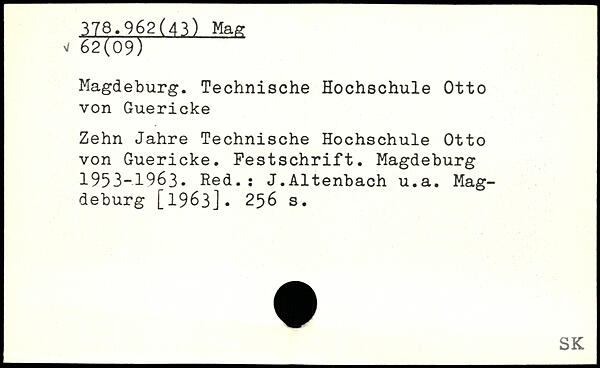 Magdeburg. Technische Hochschule Otto von Guericke Zehn Jahre Technische Hochschule Otto von Guericke. Festschrift. Magdeburg 1953-1963. Red.: J.Altenbach u.a. Magdeburg [1963].