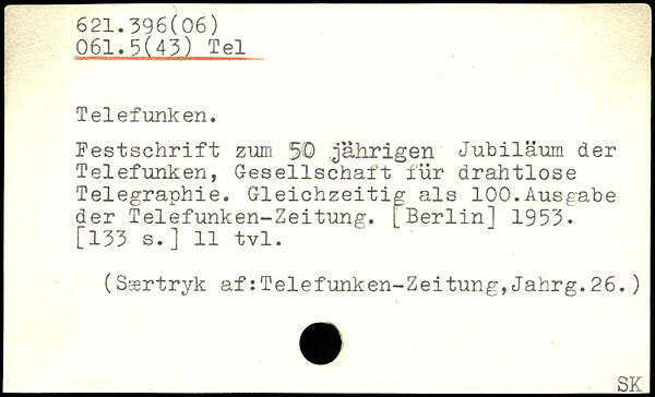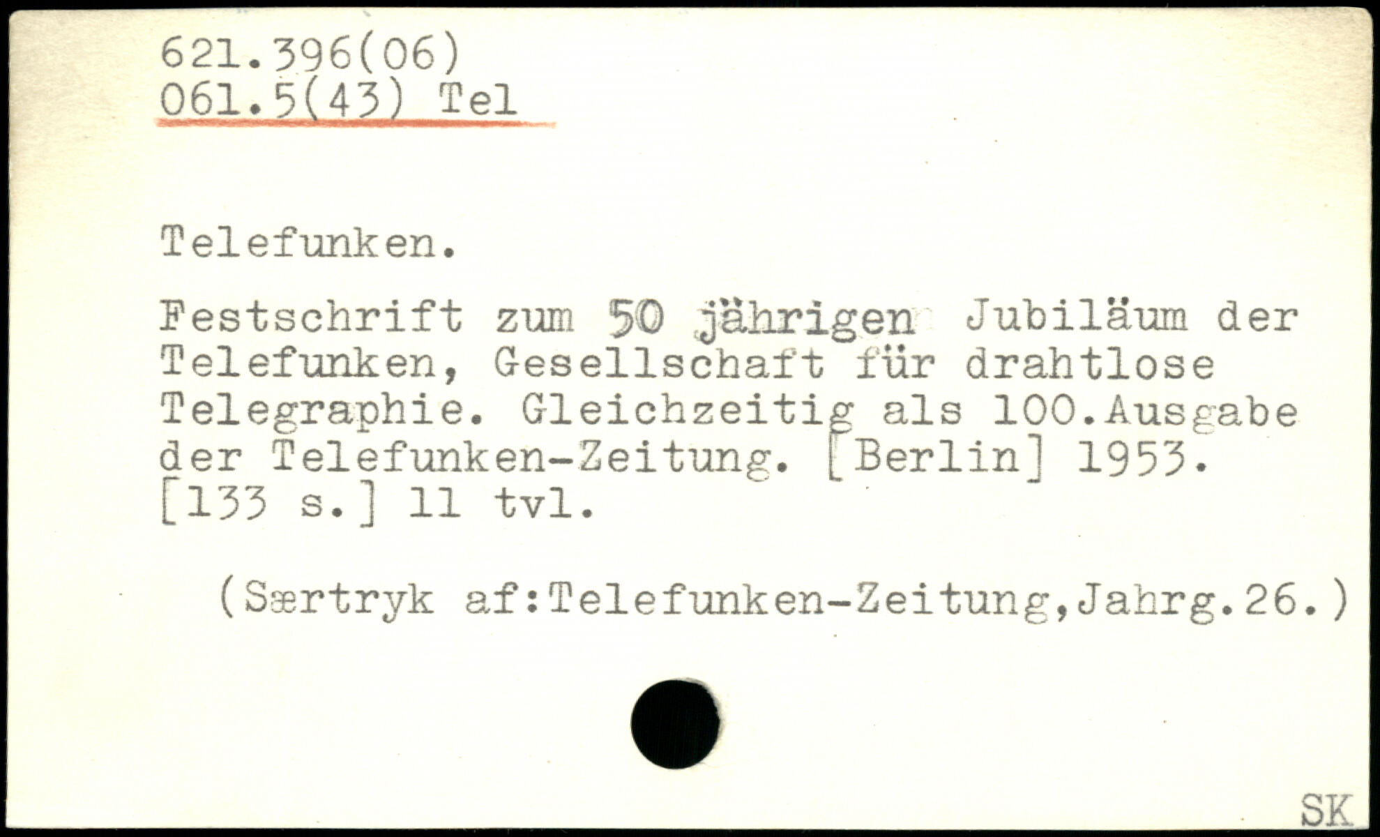 Festschrift zum 5Ö Jubiläum der Telefunken, Gesellschaft für drahtlose Telegraphie. Gleichzeitig als 100.Ausgabe der Telefunken-Zeitung. ["Berlin 1 1953.