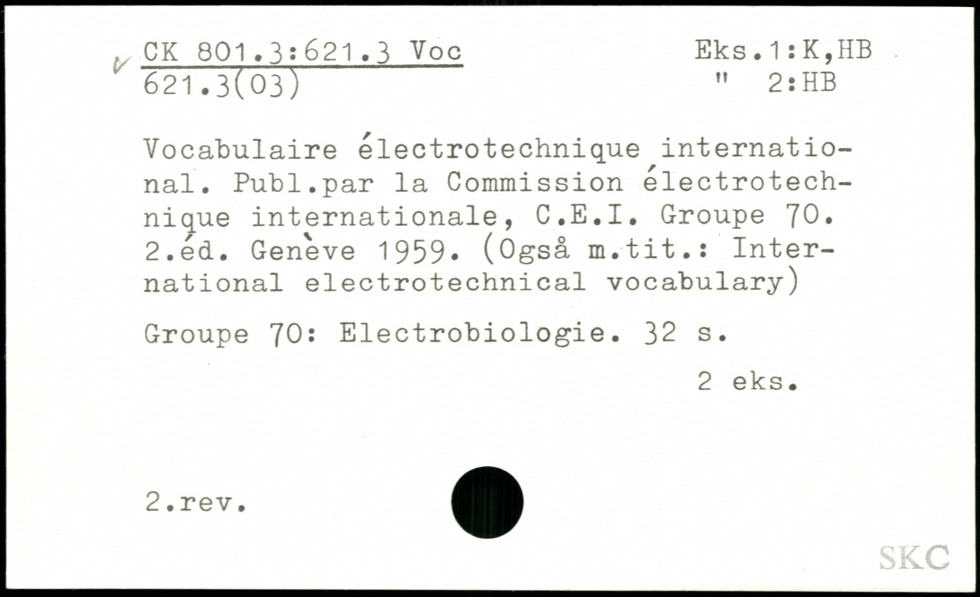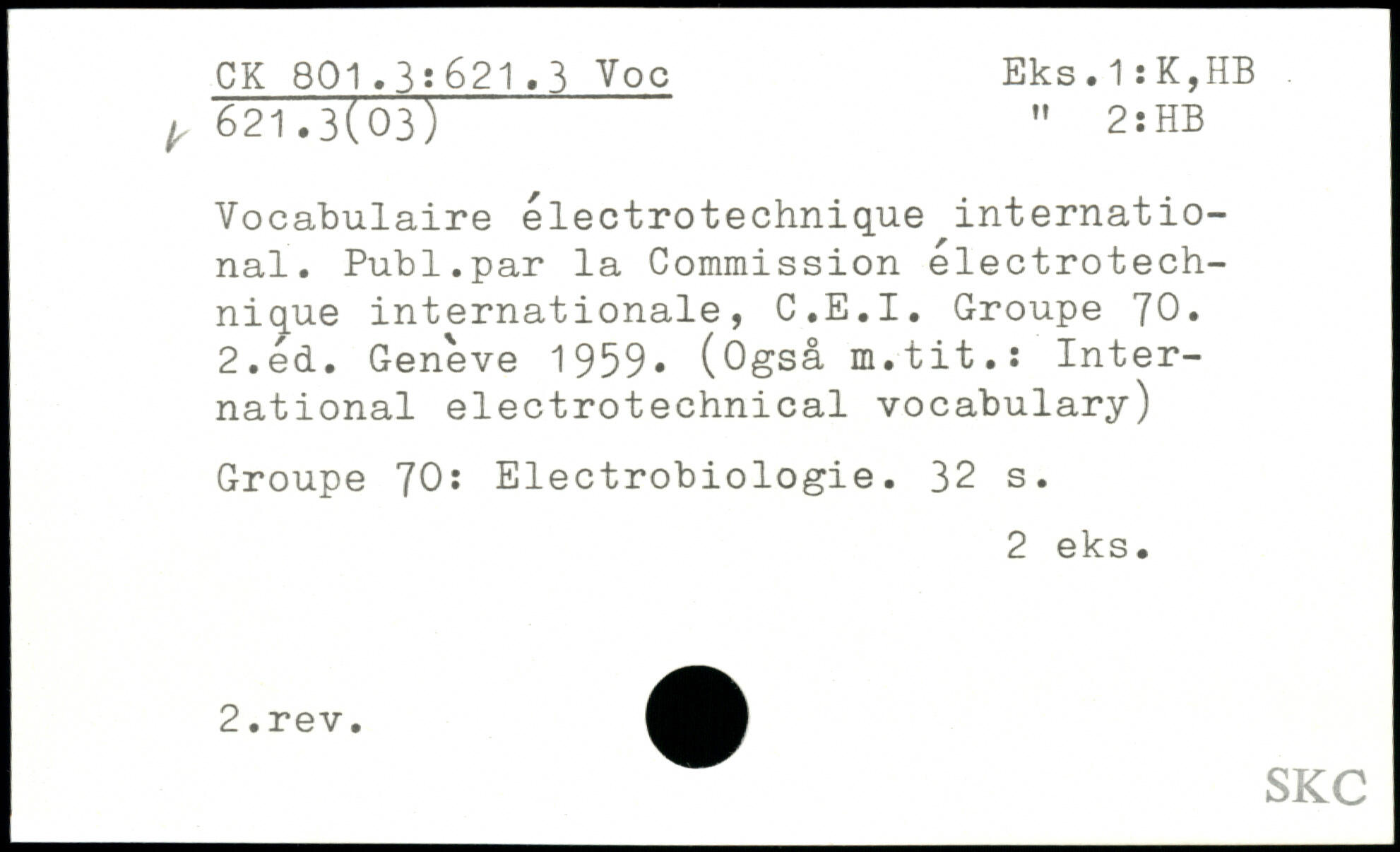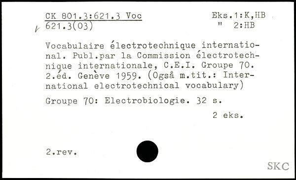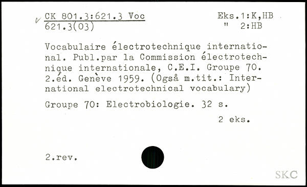 Vocabulaire électrotechnique international. Publ.par la Commission electrotech-nique internationale, C.E.I. Groupe 70.