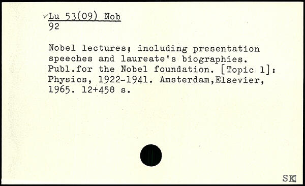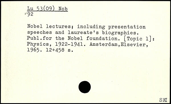 Nobel lectures? including presentation speeches and laureate's biographies. Publ.for the Nobel foundation. [Topic l]: Physics, 1922-1941.
