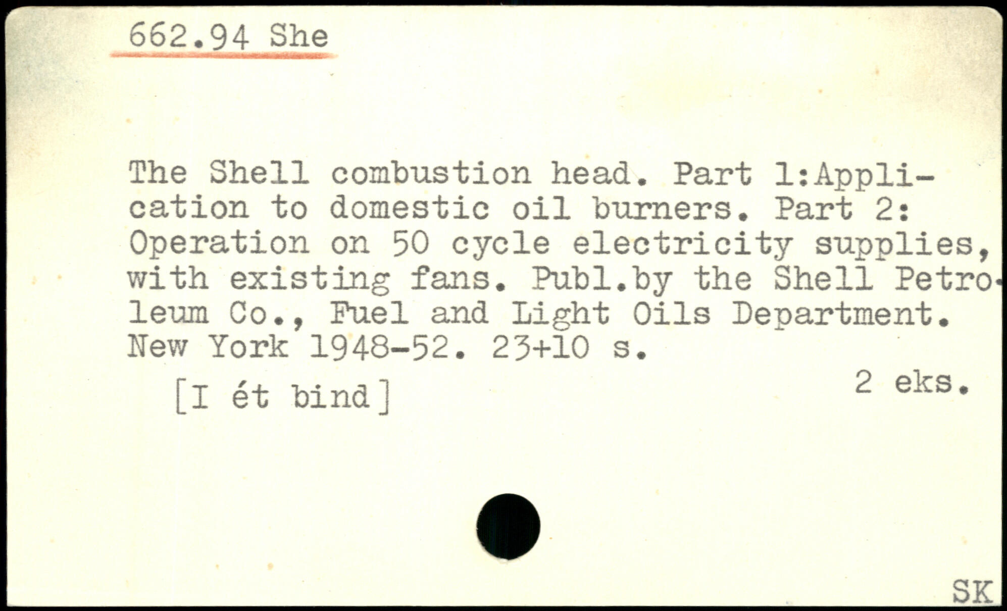 The Shell combustion head. Part 1:Application to domestic oil burners. Part 2: Operation on 50 cycle electricity supplies, with existing fans.