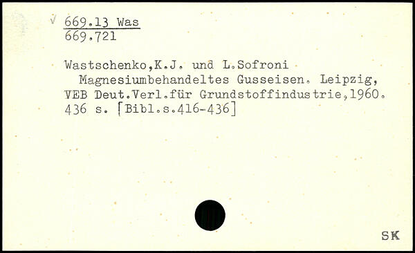 Wastschenko,K.J, und L.Sofroni Magnesiumbehandeltes Gusseisen. Leipzig, YEB Beut.Verl.für Grundstoffindus trie, 1960<>