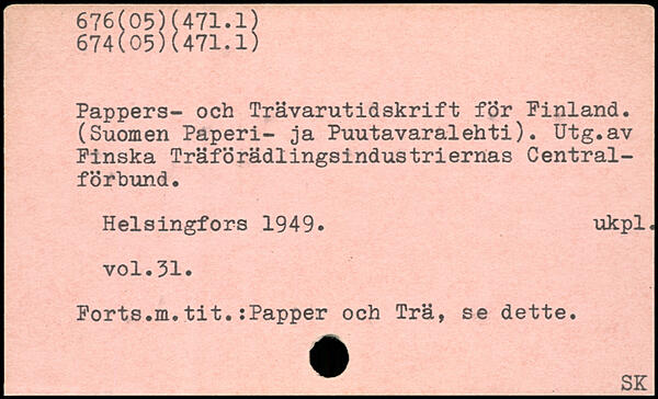 Pappers- och Trävarutidskrift för Pinland. (Suomen Paperi- ja Puutavaralehti). Utg.av Pinska Träförädlingsindustriernas Centralförbund.