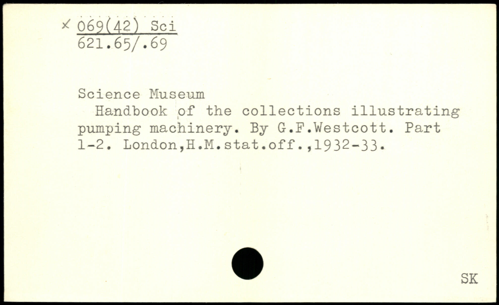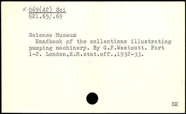 Science Museum Handbook of the collections illustrating pumping machinery. By G.F.Westcott. Part 1-2. London,H.M.stat.off.,1932-33.