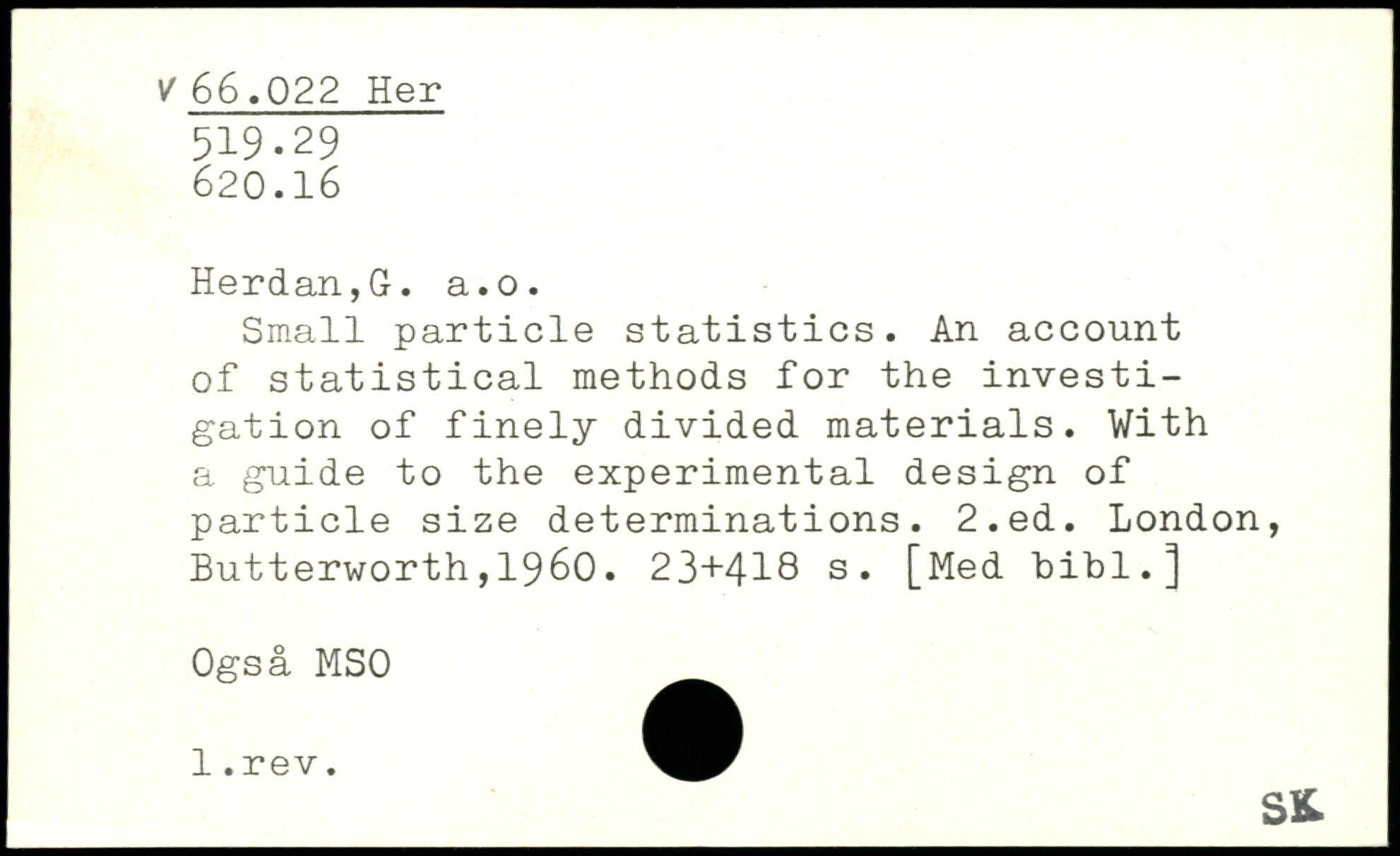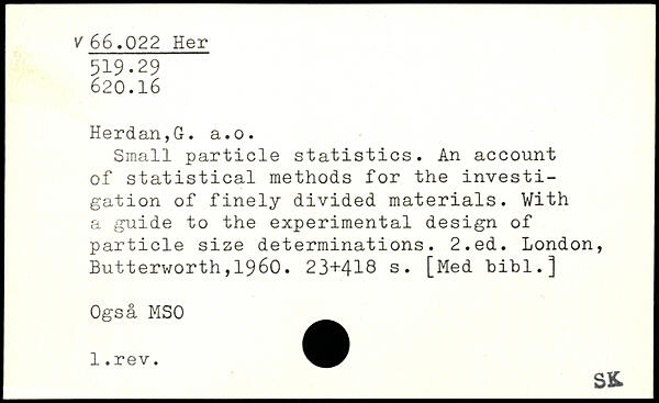 Herdan,G. a.o. Small particle statistics. An account of statistical methods for the investigation of finely divided materials. With a guide to the experimental design of particle size determinations.