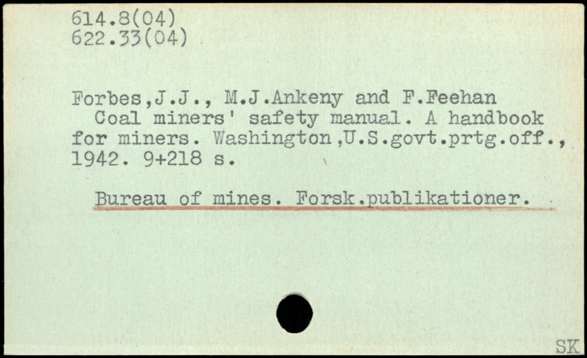 Forbes,J.J., M.J.Ankeny and F.Feehan Coal miners’ safety manual. A handbook for miners. V/ashington ,U.S.govt.prtg.off., 1942.