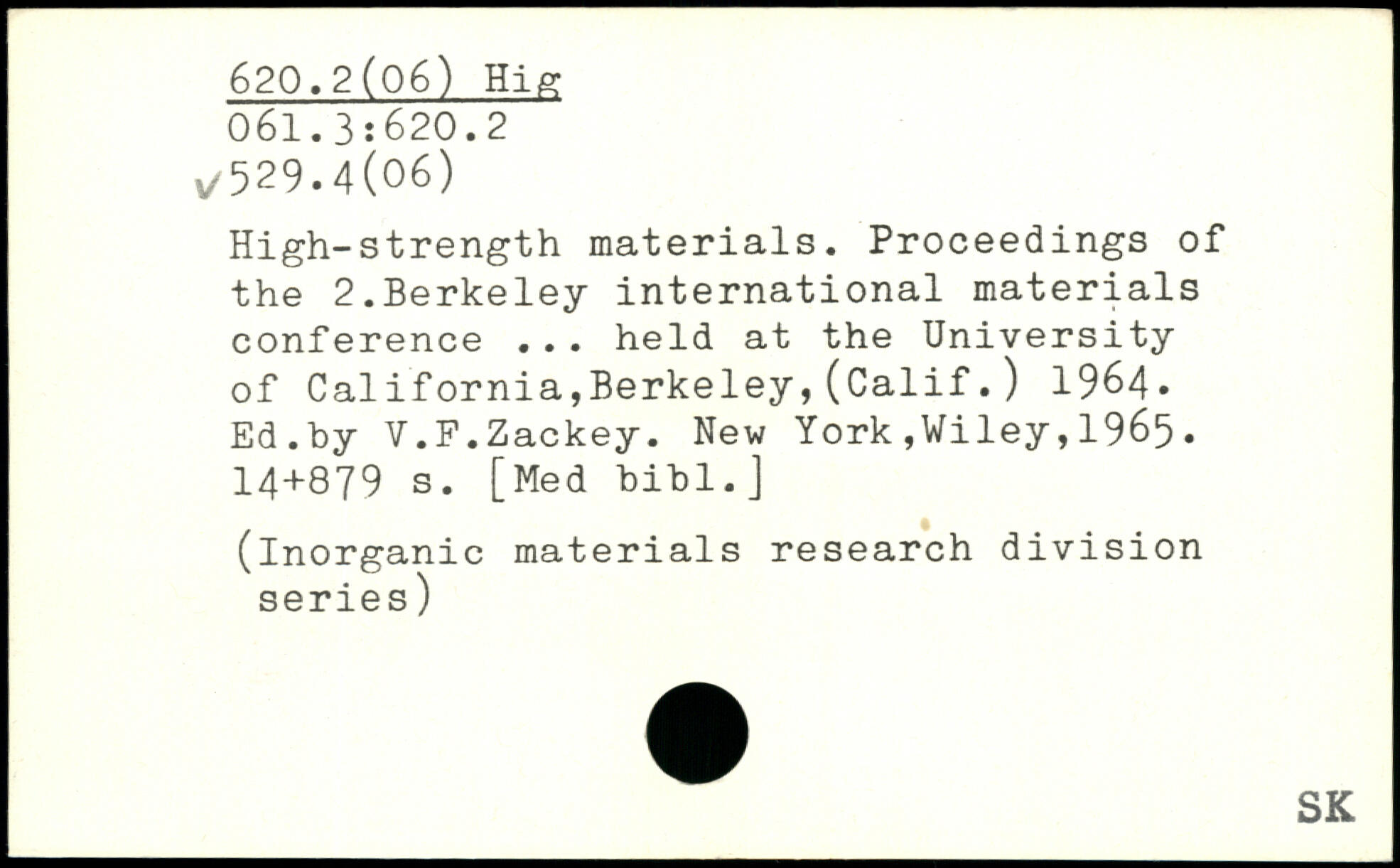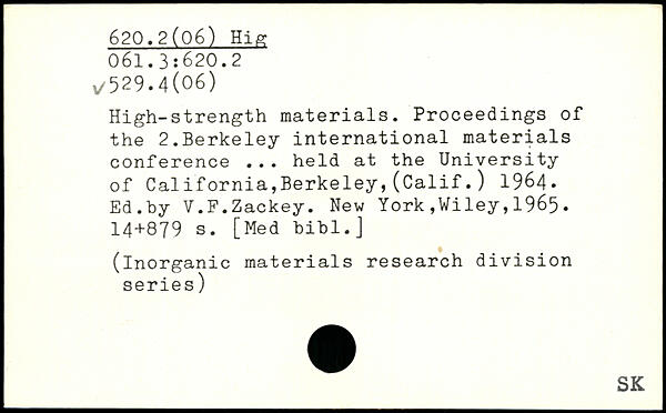 High-strength materials. Proceedings of the 2.Berkeley international materials conference ... held at the University of California,Berkeley, (Calif.) 19M. Ed.by V.F.Zackey.