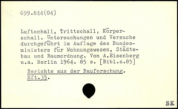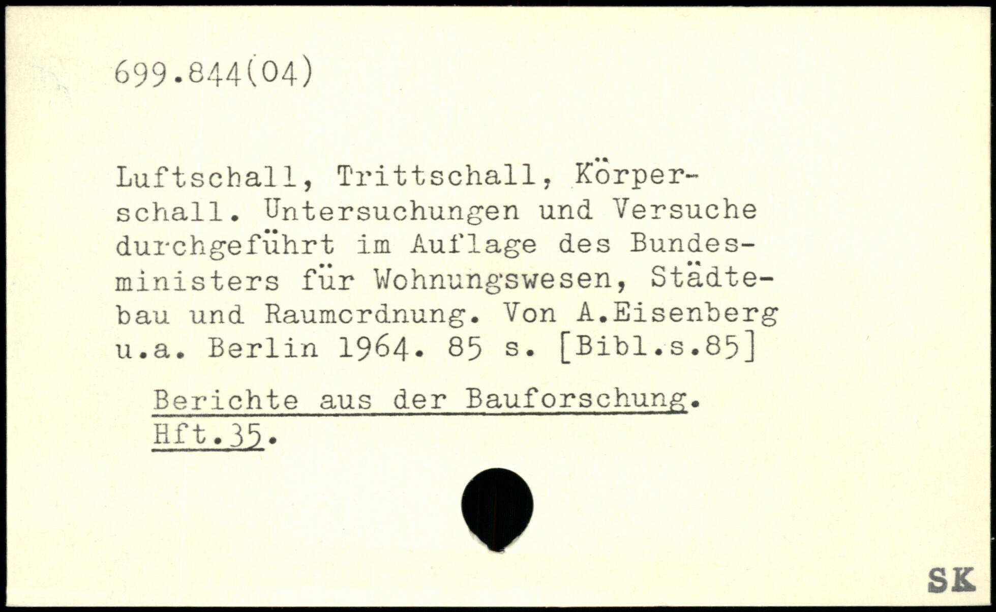 Luftschall, Trittschall, Körperschall. Untersuchungen und Versuche durchgeführt im Auflage des Bundesministers für Wohnungswesen, Städtebau und Raumordnung. Von A.Eisenberg u.a. Berlin 19ö4-
