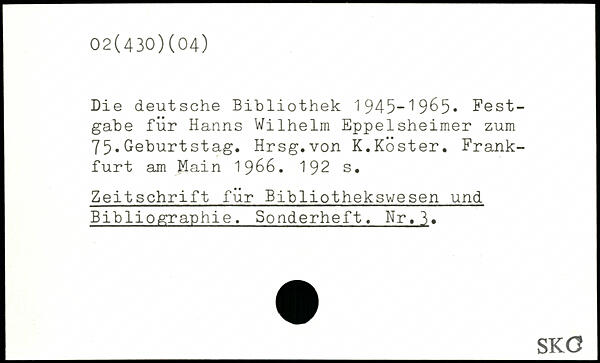 Die deutsche Bibliothek 1945-1965. Festgabe für Hanns Wilhelm Eppelsheimer zum 75.Geburtstag. Hrsg.von K.Köster.