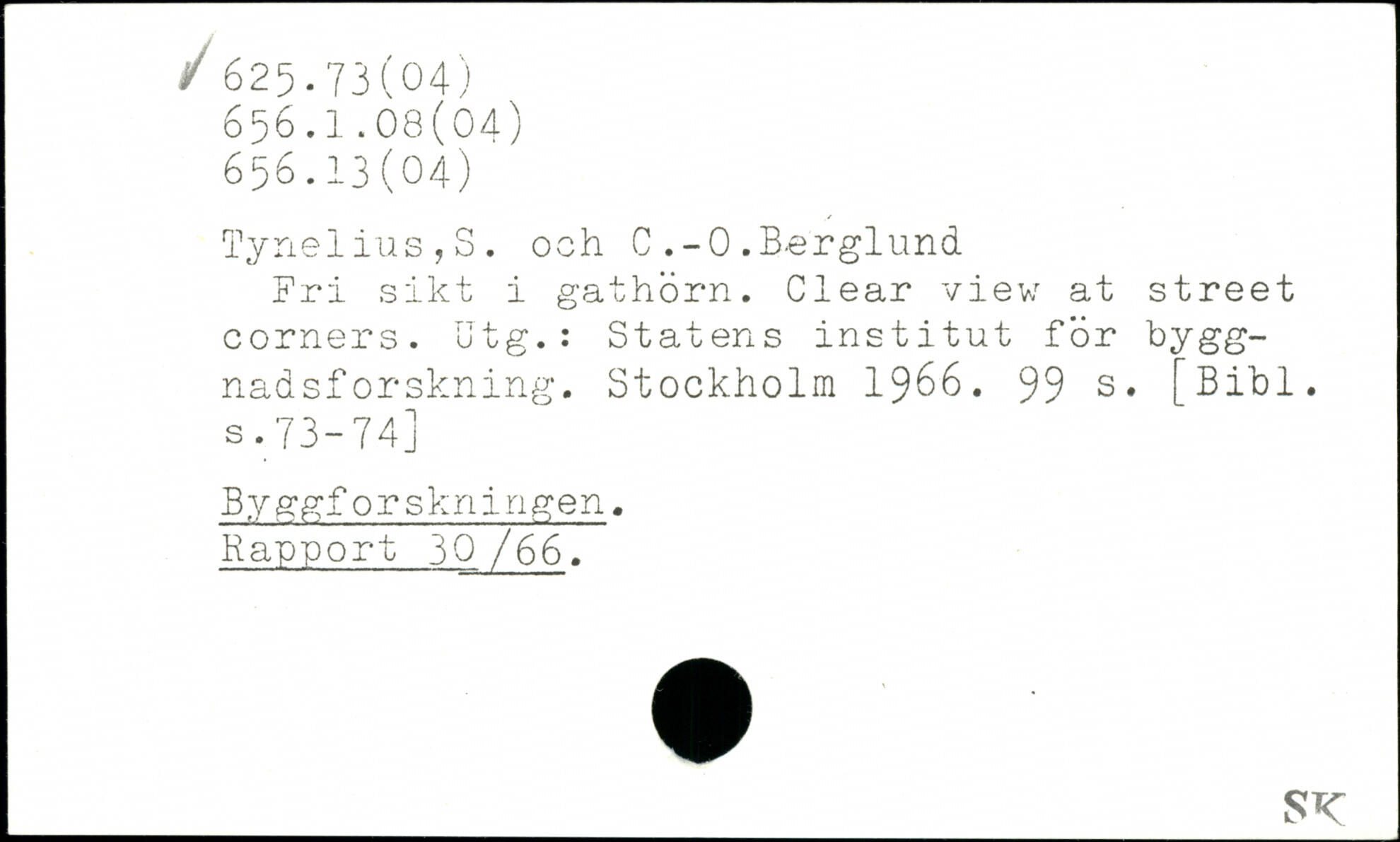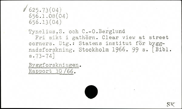 Tynelius,S. och C .-0.Berglund Fri sikt i gathörn. Clear view at Street corners. Utg.: Statens institut för byggnadsforskning.