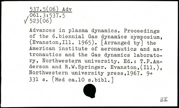 Advances in plasma dynamics. Proceedings of the 6.biennial Gas dynamics symposium, (Evanston,111. 1965). [Arranged by] the American institute of aeronautics and as^ tronautics and the Gas dynamics laboratory, Northwestern university. Ed.: T.P.Anderson and R.V.Springer. Evanston,(111.), Northwestern university press,1967. 9+