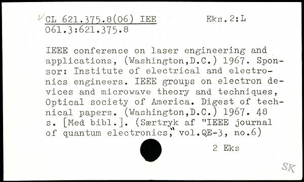 IEEE conference on laser engineering and applications, (Washington,D.C.) 1967. Sponsor: Institute of electrical and electronics engineers. IEEE groups on electron devices and microwave theory and techniques, Optical society of America. Digest of technical papers. (Washington,D.C.) 1967-