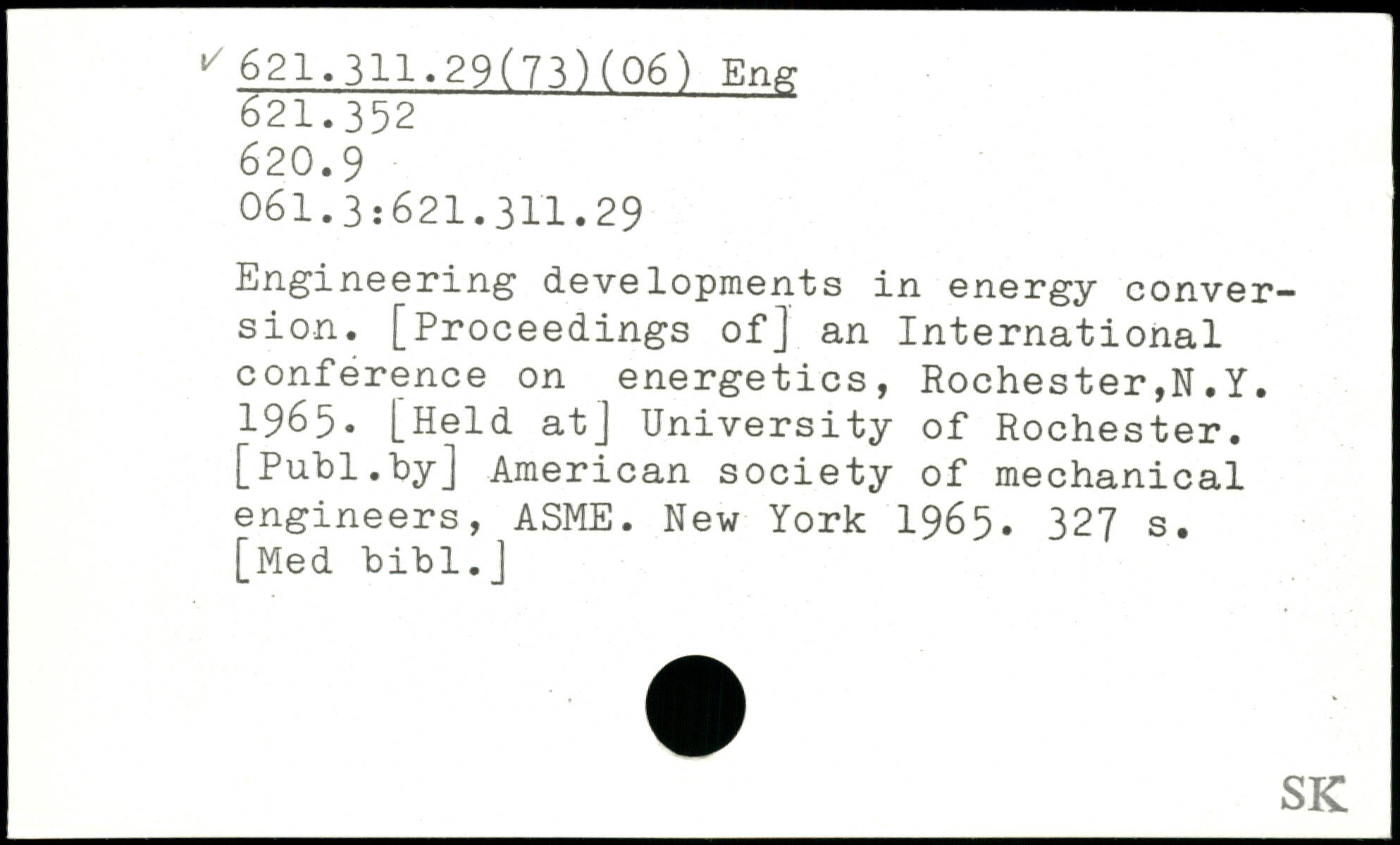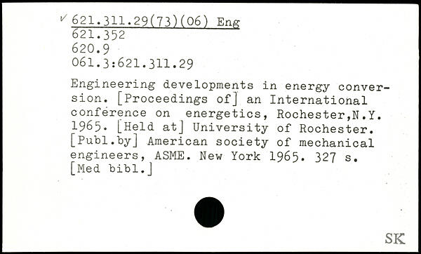 Engineering developments in energy conversion. [Proceedings of] an International conference on energetics, Rochester,N.Y. 1965. [Held at] University of Rochester. [Puhl.by] American society of mechanical engineers, ASME.