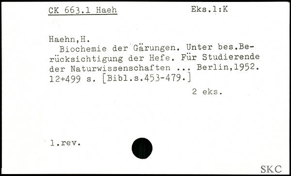 Biochemie der Gärungen. Unter bes.Berücksichtigung der Hefe. Für Studierende der Naturwissenschaften ... Berlin,1952.