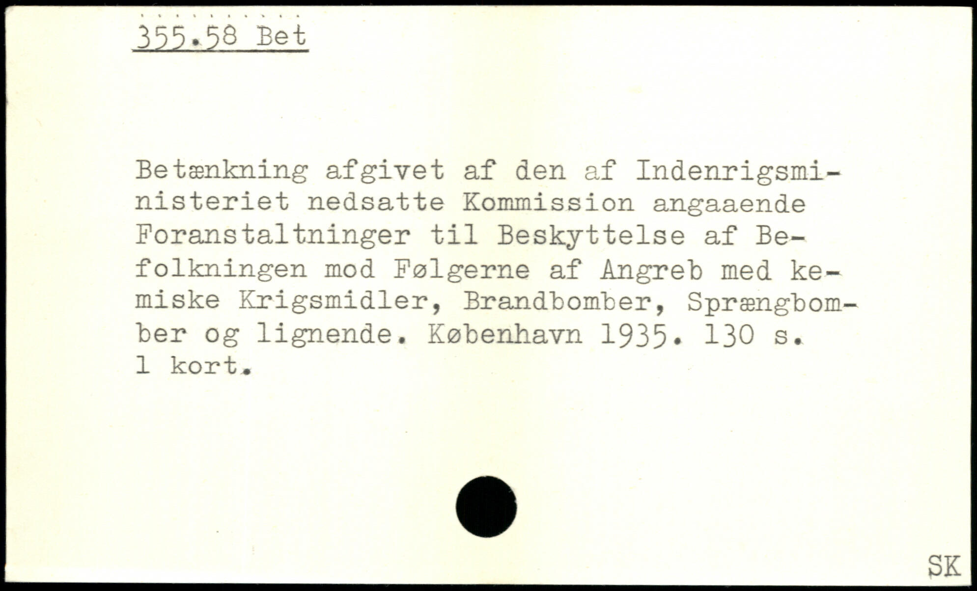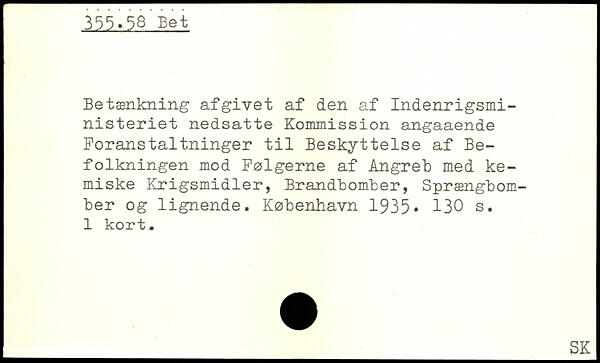 Betænkning afgivet af den af Indenrigsministeriet nedsatte Kommission angaaende Foranstaltninger til Beskyttelse af Befolkningen mod Følgerne af Angreb med kemiske Krigsmidler, Brandbomber, Sprængbomber og lignende.