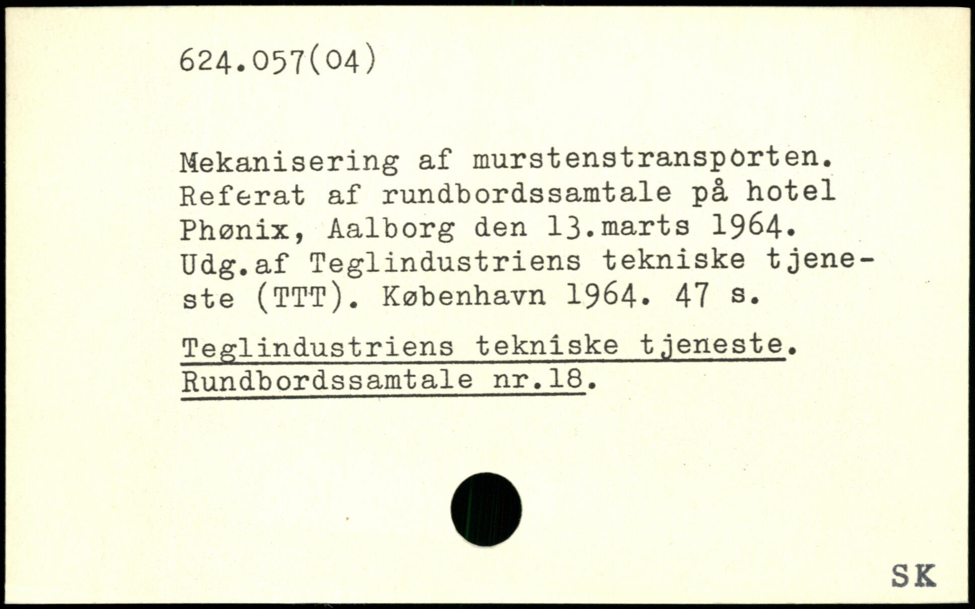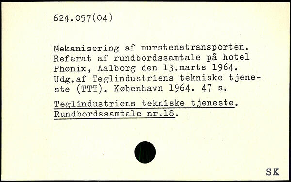 Mekanisering af murstenstransporten. Referat af rundbordssamtale på hotel Phønix, Aalborg den 13.marts 1964. Udg.af Teglindustriens tekniske tjeneste (TTT).