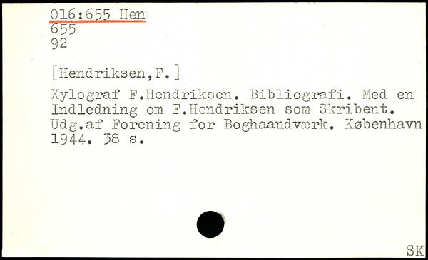 [Hendriksen,F.j Xylograf F. Ilend riks en, Bibliografi. Med en Indledning om F.Hendriksen som Skribent, Udg,af Forening for Boghaandværk.