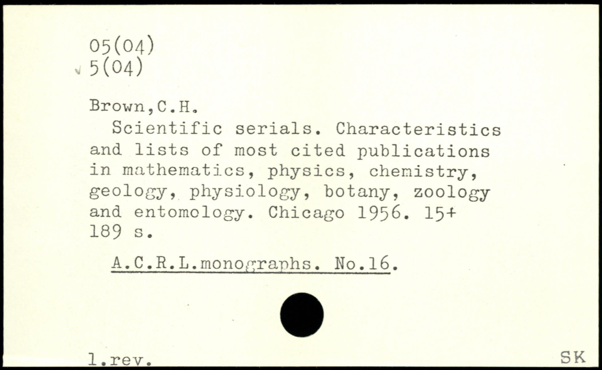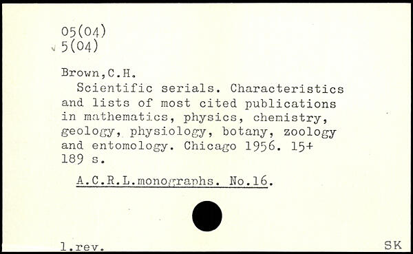 Scientific serials. Characteristics and. lists of most cited publications in mathematics, physics, chemistry, geology, physiology, botany, zoology and entomology.