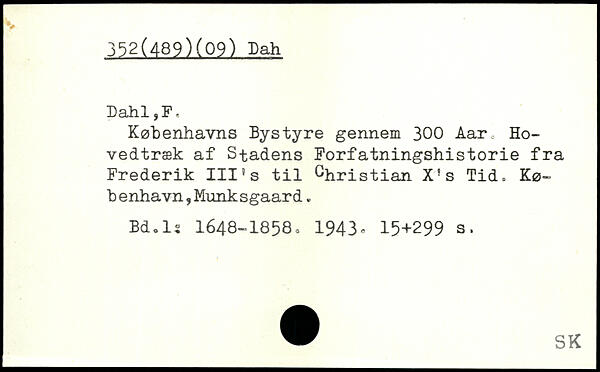 Københavns Bystyre gennem 300 Aar Hovedtræk af Stadens Forfatningshistorie fra Frederik III’s til 0hristian X’s Tid, Kø-b enhavn,Munksgaard. Bd.ls 1648-18580 1943^