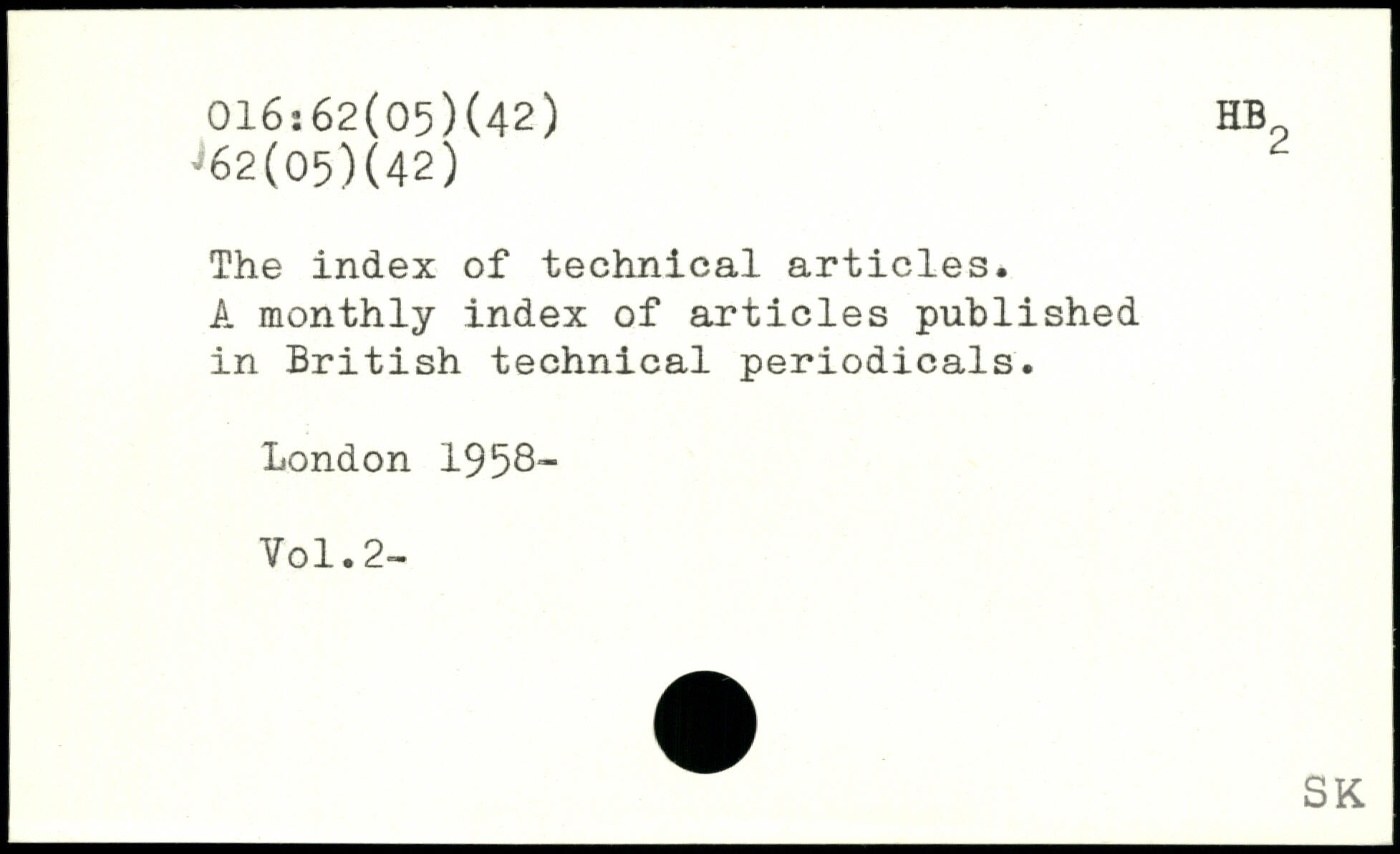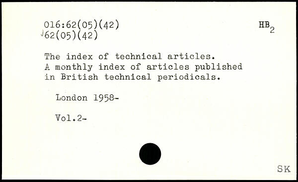 The index of technical articles. A monthly index of articles published in British technical periodicals.