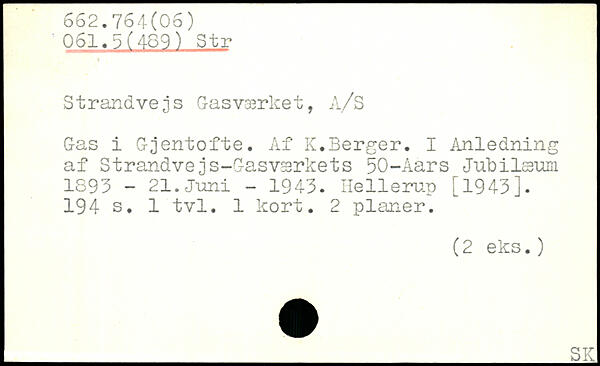 Strandvejs Gasværket, A./S Gas i Gjentofte. Af K.Berger. I Anledning af Strandvejs-Gasværkets 50-Aars Jubilæum 1895 - 21.Juni - 1945. Hellerup [1945].
