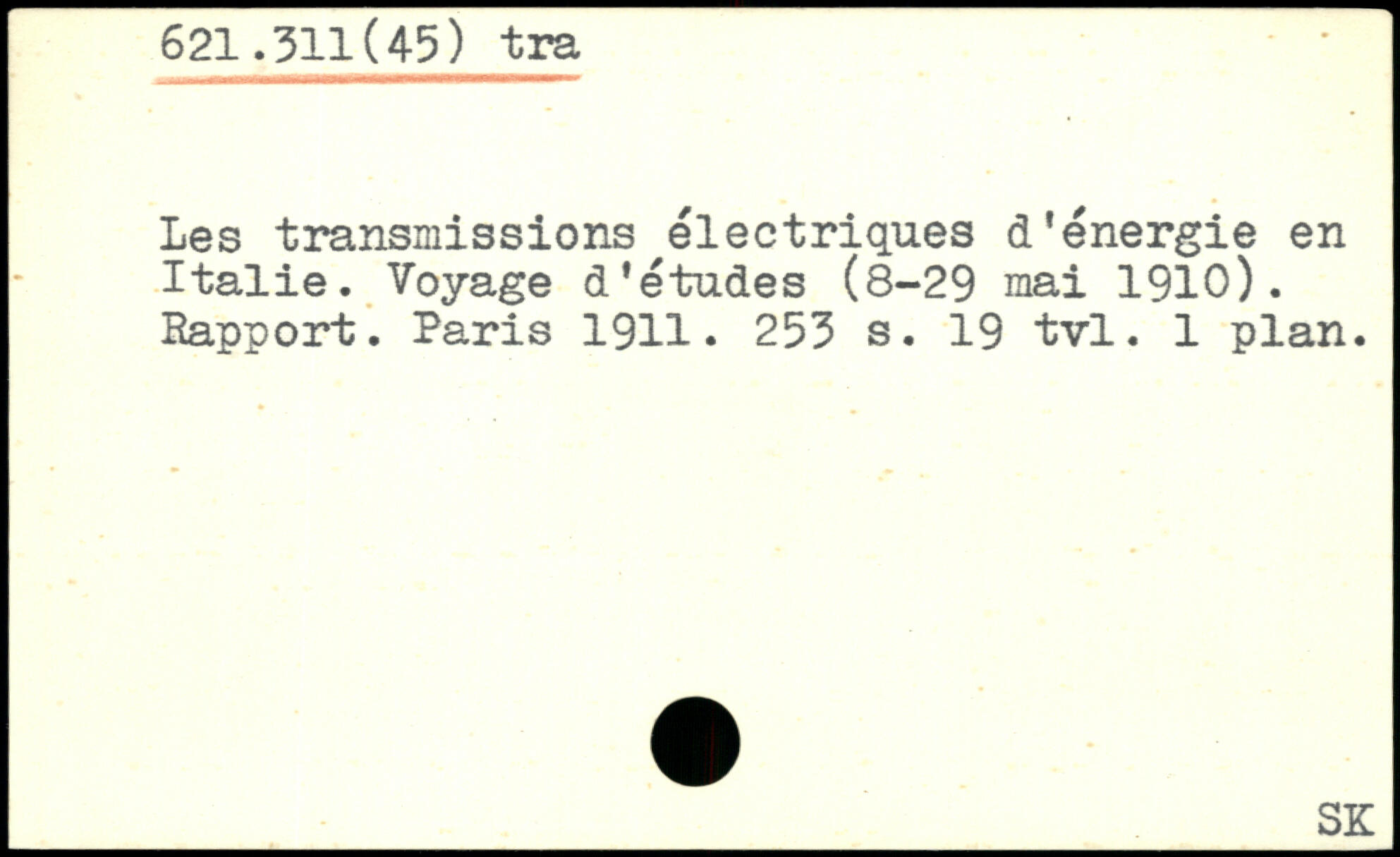 621.311(45) traies transmissions électriques d'énergie en Italie. Voyage d'études (8-29 mai 1910). Rapport.