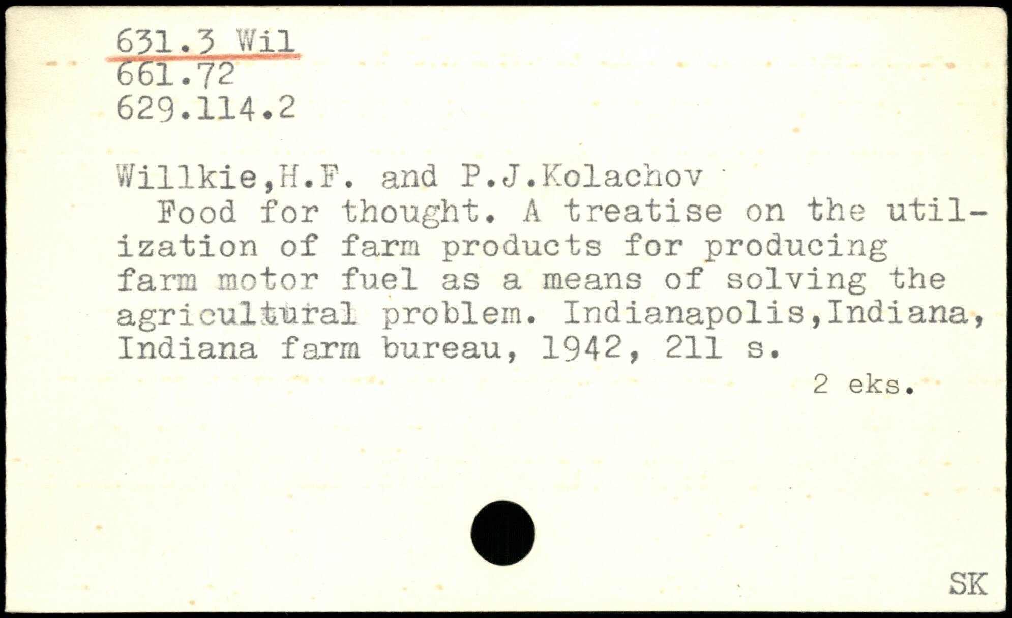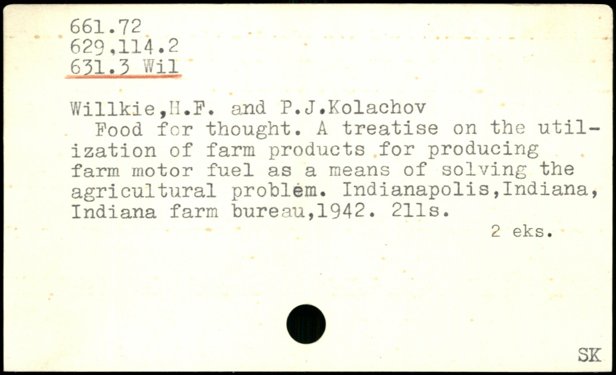 Willkie,H.F. and P.J.Kolachov ' Food for thought, A treatise on the utilization of farm products for producing farm motor fuel as a means of solving the agricultural problem.