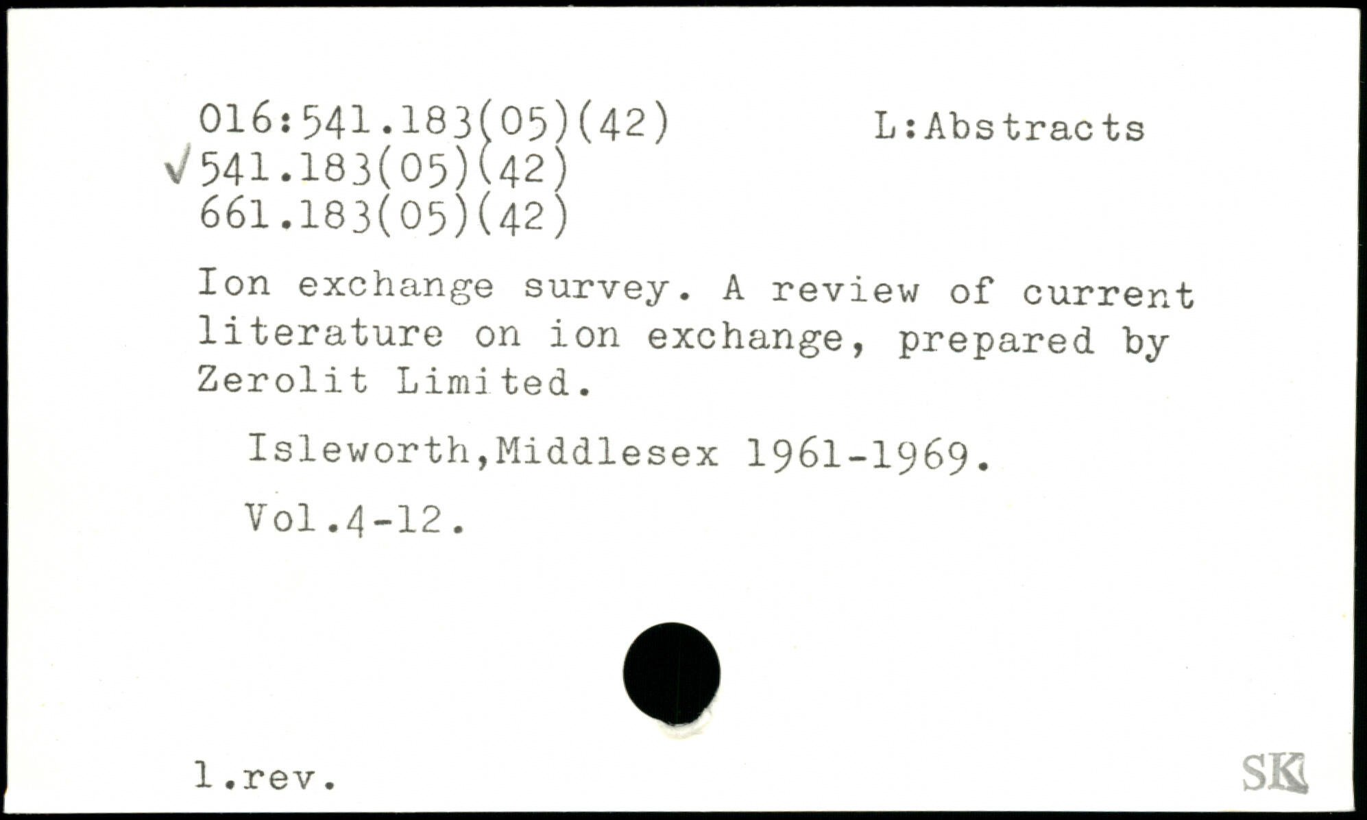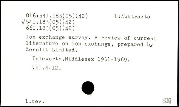 Ion exchange survey. A review of current literature on ion exchange, prepared by Zerolit Limited. Isleworth,Middlesex 1961-1969.