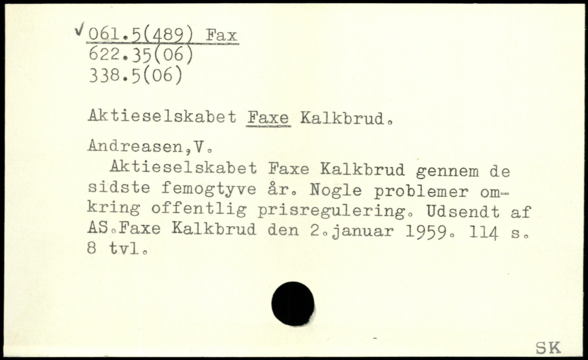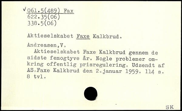 Aktieselskabet Faxe Kalkbrud, Andreasen,Yo Aktieselskabet Faxe Kalkbrud gennem de sidste femogtyve år. Kogle problemer om-kring offentlig prisreguleringo Udsendt af AS o Faxe Kal kbrud den 2 , januar 1959,