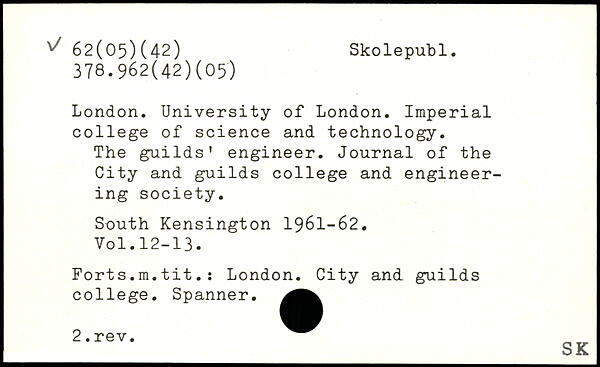 London. University of London. Imperial college of science and technology. The guilds' engineer. Journal of the City and guilds college and engineering society. South Kensington 1961-62.