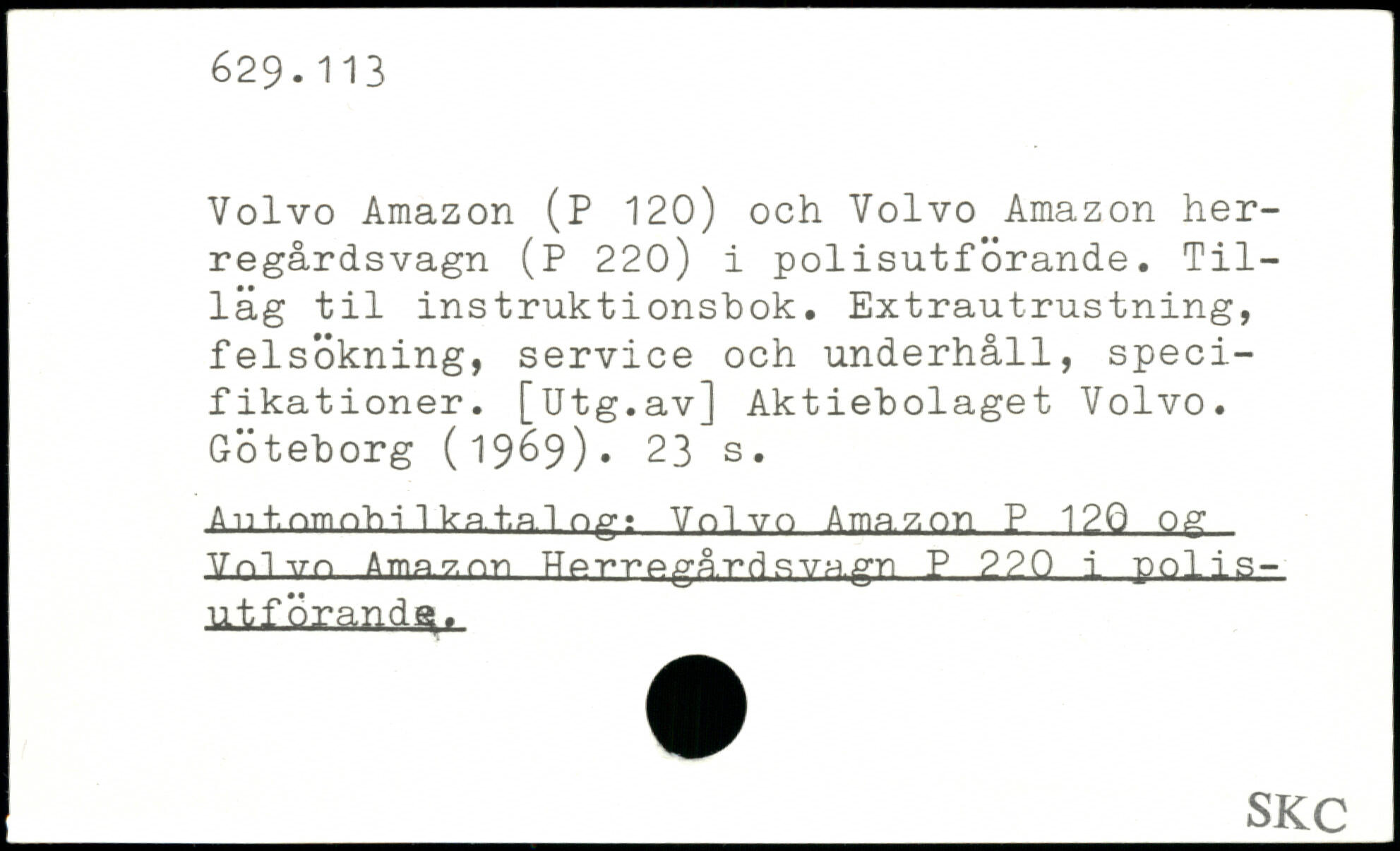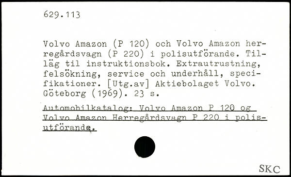 Volvo Amazon (P 120) och Volvo Amazon her-regårdsvagn (P 220) i polisutförande. Tillag til instruktionsbok. Extrautrustning, felsökning, service och underhåll, specifikationer. [Utg.av] Aktiebolaget Volvo. Göteborg (19^9).