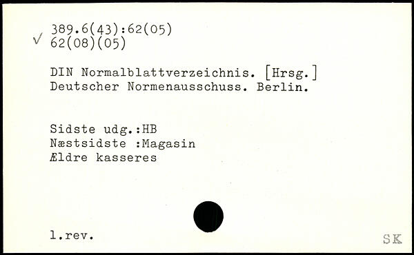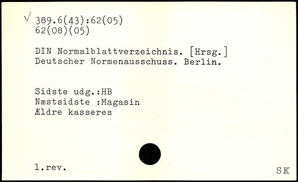 DIN Normalblattverzeichnis. [Hrsg.] Deutscher Normenausschuss. Berlin. Sidste udg.:HB Næstsidste :Magasin Ældre kasseres l.rev. SK