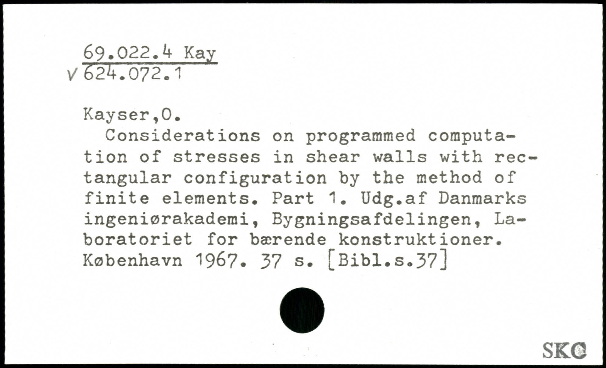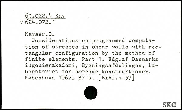 Considérât ions on programmed computation of stresses in shear walls with rectangular configuration by the method of finite elements. Part 1. Udg.af Danmarks ingeniørakademi, Bygningsafdelingen, Laboratoriet for bærende konstruktioner.