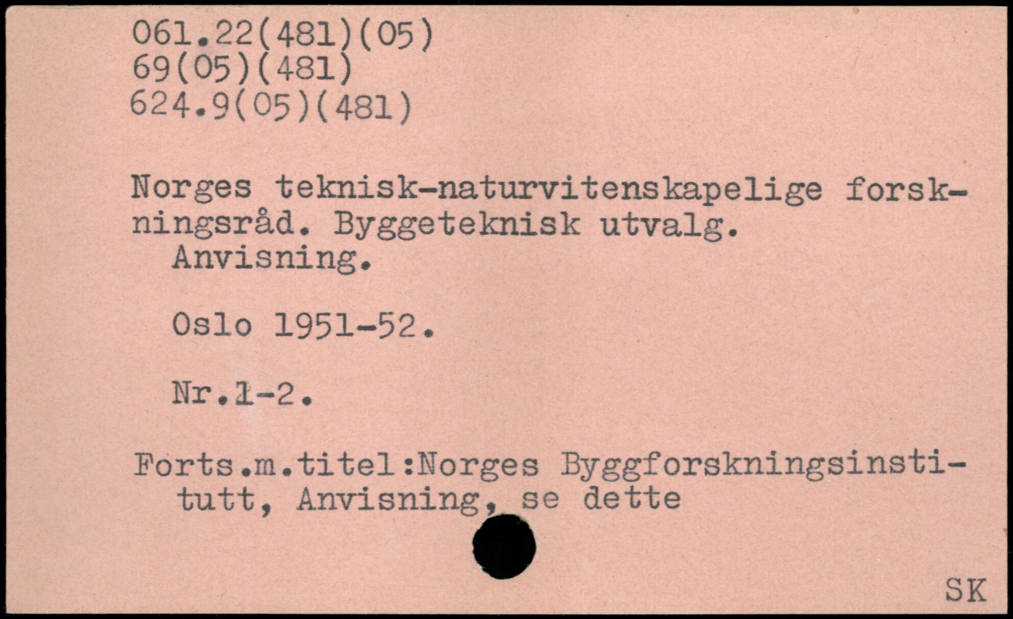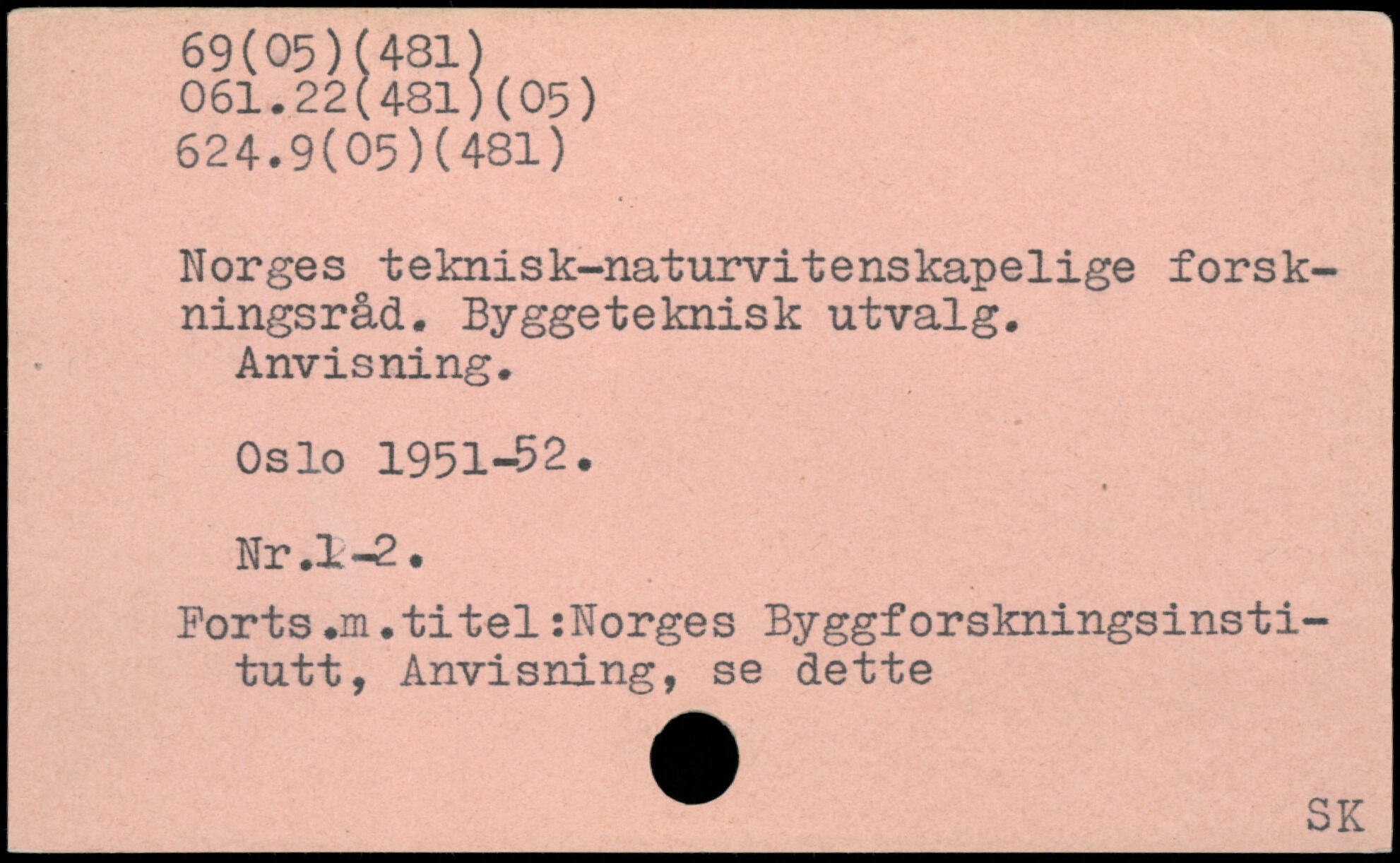 Norges teknisk-naturvitenskapelige forskningsråd. Byggeteknisk utvalg. Anvisning. Oslo 1951-52. Nr .1-2. Ports .m.titel:Norges Byggforskningsinsti-tutt, Anvisning, se dette