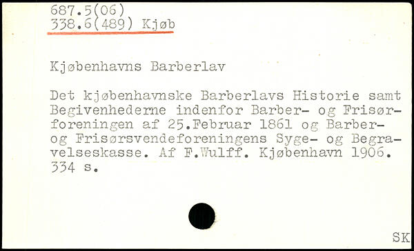 Kjøbenhavns Barberlav Det kjøbenhavnske Barberlavs Historie samt Begivenhederne indenfor Barber- og Brisør-foreningen af 25.februar 1861 og Barber-og frisørsvendeforeningens Syge- og Begravelseskasse. Af f.Wulff. Kjøbenhavn 1906.