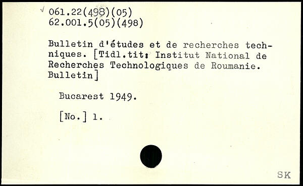 Bulletin d'études et de recherches techniques. [Tidl.titj Institut National de Recherches Technologiques de Roumanie. Bulletin]